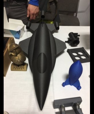 I am honored that the 3DXTech guys used my Rocket Plane to show off their filament at the Midwest RepRap Festival. I am guessing this is one of their carbon fiber filaments.