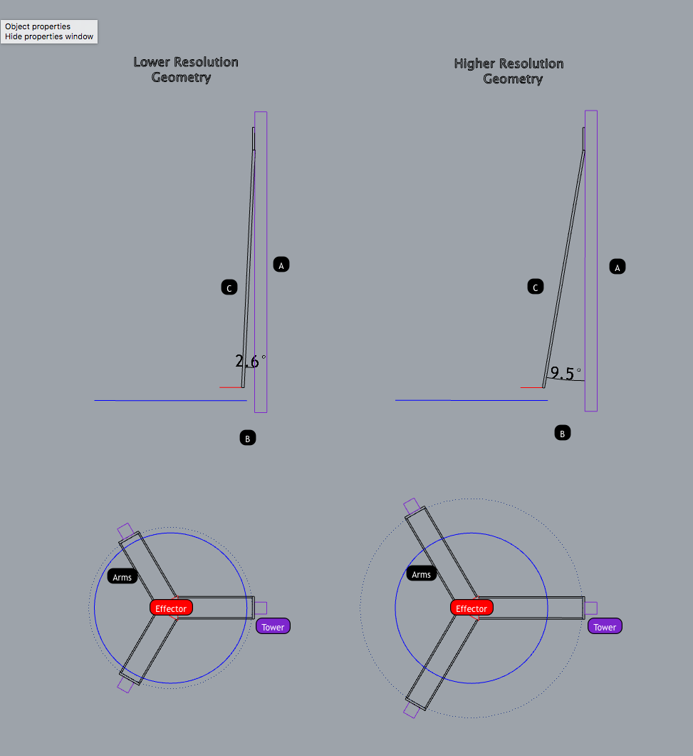 Delta motion is based on trigonometry. You can learn more from Steve Graves excellent Johann C. Rocholl (Rostock) Style Delta Kinematics. But in a nutshell, resolution decreases as the effector moves from the center to the periphery of the build surface. As resolution decreases, so does positioning precision. If you look at a "Kossel style" printer you will see the columns and carriages are much further away from the edge of the build plate than the Rostock Max. Take a look at the drawing below. Remember the Pythagorean theorem A^2 + B^2 = C^2 ? On a delta the hypotenuse (C) of the right triangle is the arms and is a fixed length. The carriage movement up and down the tower defines (A) and the constraints from the other two towers through the effector is (B). As (A) and (C) get closer together (the angles marked in the drawing) it takes less movement of the carriage up/down to have a big effect on (B) (movement in the X-Y plane of the nozzle). Think about it. The larger the tower-arm angle is at the very perimeter of the build plate the higher the precision you get.