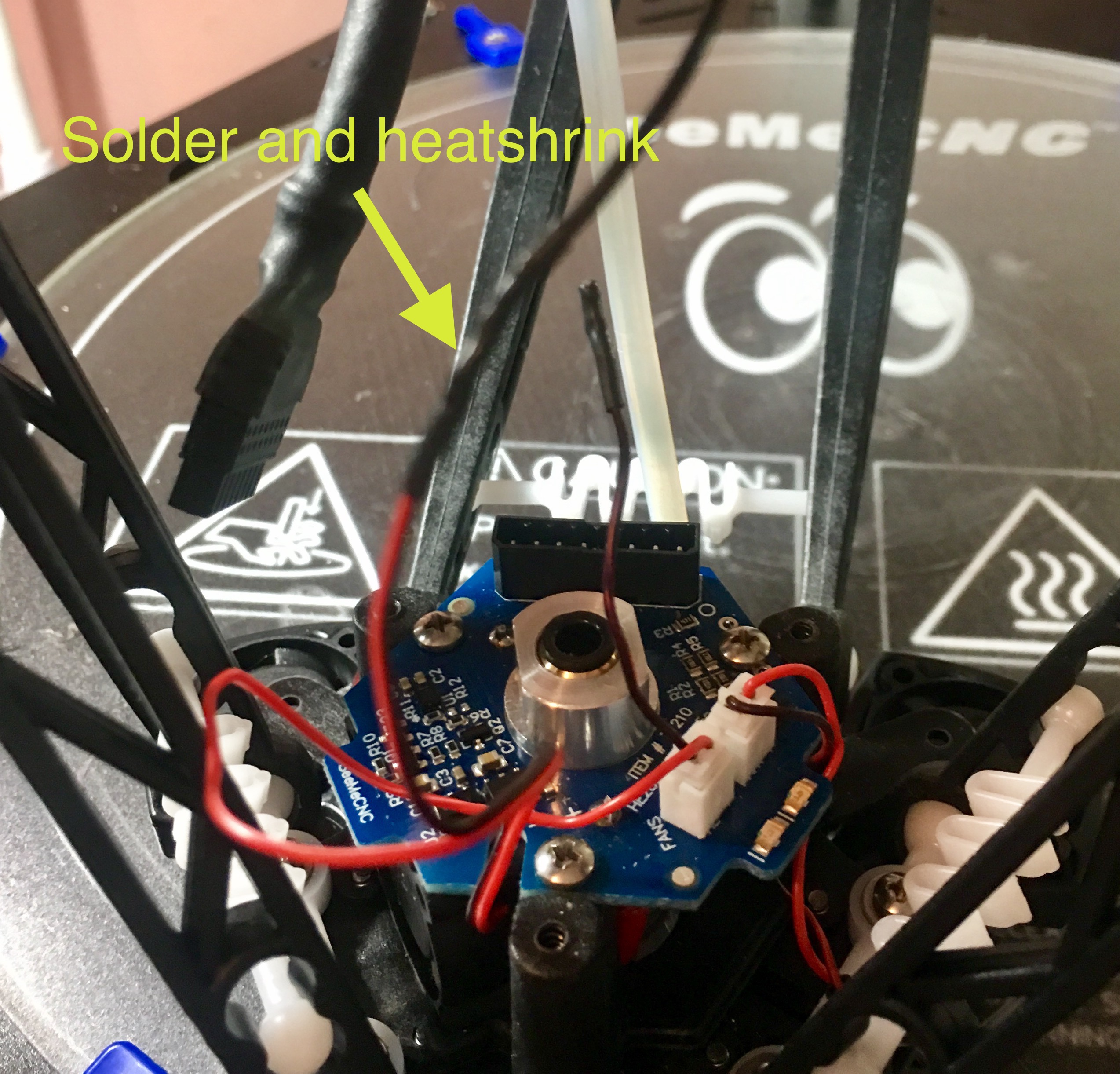 Now we are going to remove the connector and top cover from the HE280. Inside looks like this: The arrow points to the connector for the heatsink fan. Clip the black wire about 2" from the connector. Then strip and solder the other end to the new black wire. Make sure to put on a piece of heatshrink tubing before soldering. There will be a short (2") black wire hanging free off the connector, that's correct. I like to put a little piece of shrink tube over the end to insulate it. Now we are going to make the connection to RAMBo. The new black wire inserts into the connector like this: The connector fits into the top edge of the RAMBo at the position marked Heat 1 - NOT Fan 1, like this: That's it! Before buttoning everything up, test to make sure the fan comes on at 40°. You will need to plug in the HE280 connector and then turn on the printer. Then set the hotend temperature (LCD display is easiest) to 150°C (the minimum it lets you set). Watch and listen. If the fan comes on at 40° turn the hot end off and turn off the printer.