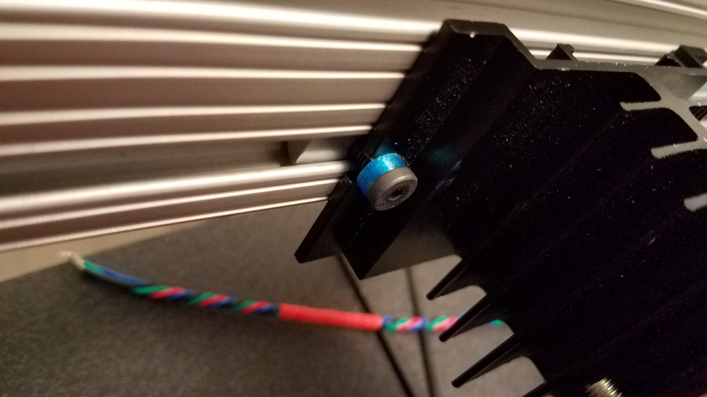 Parts are fixed to the frame using Unbrako #10-32 x 1/2 low-head caphead screws and 80/20 Inc T-Slot HW 10 Series 10-32 Roll-In T-Nut w/Ball Spring #3922 N.