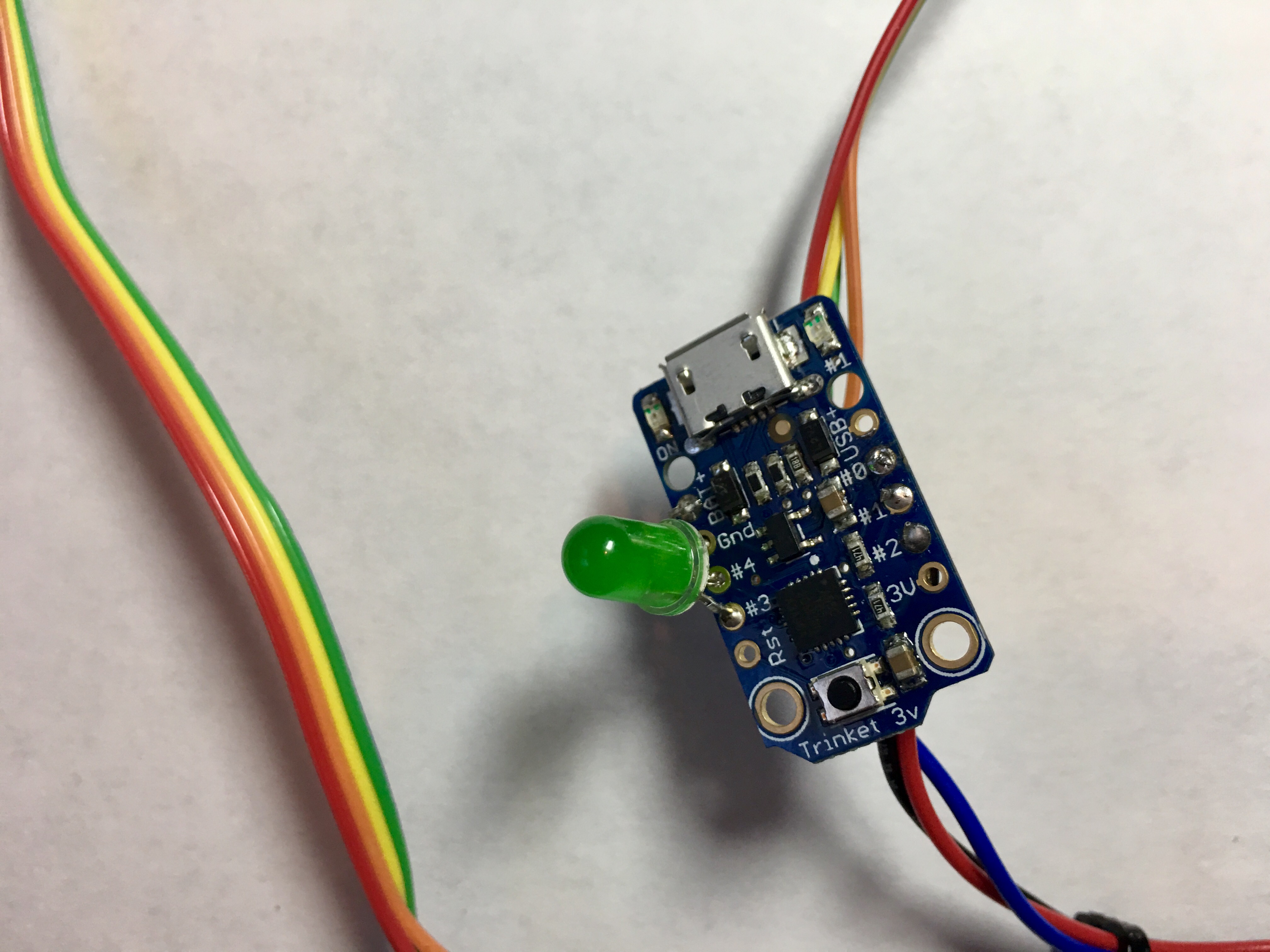 You'll also see an LED in my photos, that was a status LED so I could debug the thing. There is a little red LED on the Trinket that will flash when a probe hits so you don't need the extra LED. In fact, I need to use it's pin for the version that takes advantage of the MOD pin on the Duet Probe connector.