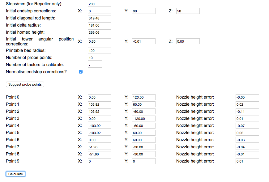 Here are some calibrations I did the other night. Look at the pattern of the first six results. The points are arranged in a hexagonal pattern around the bed. I started with the measured diagonal rod length, and the calculated steps per mm (GT2 belt, 1/32 microstepping, 0.9 degree motors, and the number of teeth on the pulley = 200 steps/mm) , and ran through a couple of cycles of the delta calibrator until it converged.
