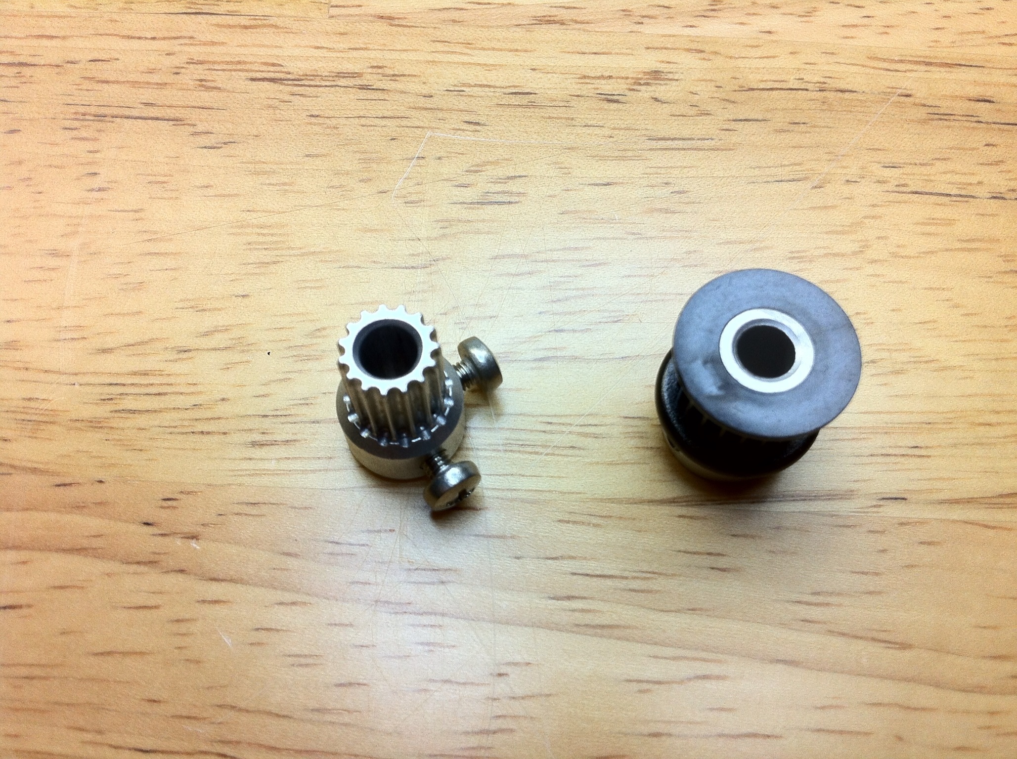 Here's a picture of a new 20-tooth pulley next to a 15-tooth pulley. The old pulley has half-round valleys between the peaks like I'd expect, but the new one has flat-bottom valleys, flat-top peaks, and flat sides on the teeth. Doesn't seem quite like it fits the belt profile, but it claims to be GT2. The pulleys are from RepRapDiscount, apparently, from the URL on the pulleys.