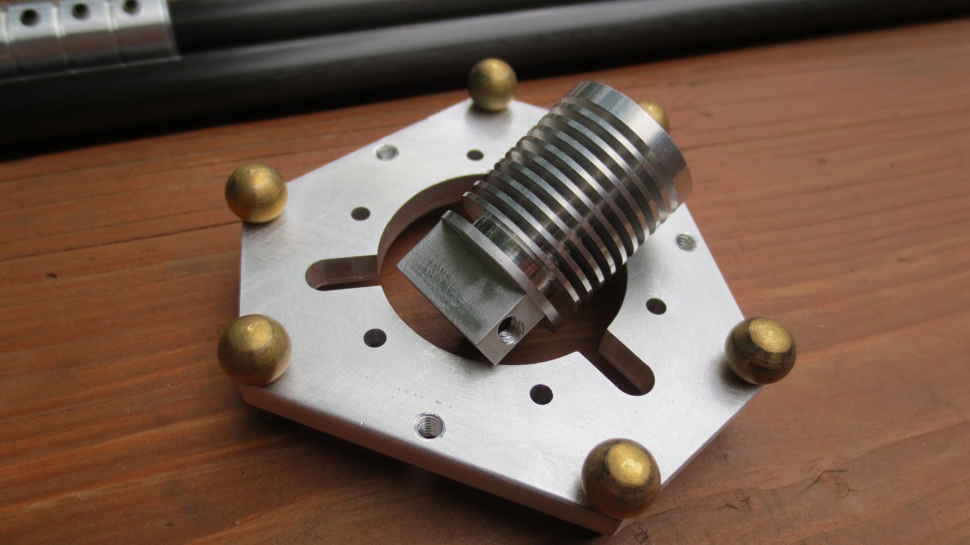 These are the balls I'm considering. They're 0.375 diameter with 8-32 tapped holes. They come in plain brass and nickel plated brass, shown next to a 3/8 chrome steel ball bearing for comparison.