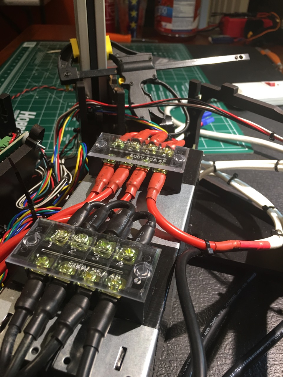 Heat dissipation was one of the things that I was initially worried about, as these are rather beefy power supplies. With the sides on, it's a bit hotter than I felt comfortable for the long-term life of melamine. However, by just taking one of the covers off temps run at about 10 degrees over ambient, which I'm really happy about. I plan on installing a small fan on one of the sides as soon as I locate a .stl of one of the sides, since I'm terrible at best at design; anyone have a copy? Will run a 24v fan on a 12v tap to keep db levels low. BTW, the power supply fans (remember there are 2 of them!) are variable and combined are quieter than the peek fan on my E3d, which is a HUGE plus to me, as I am usually in the workshop when I'm printing.
