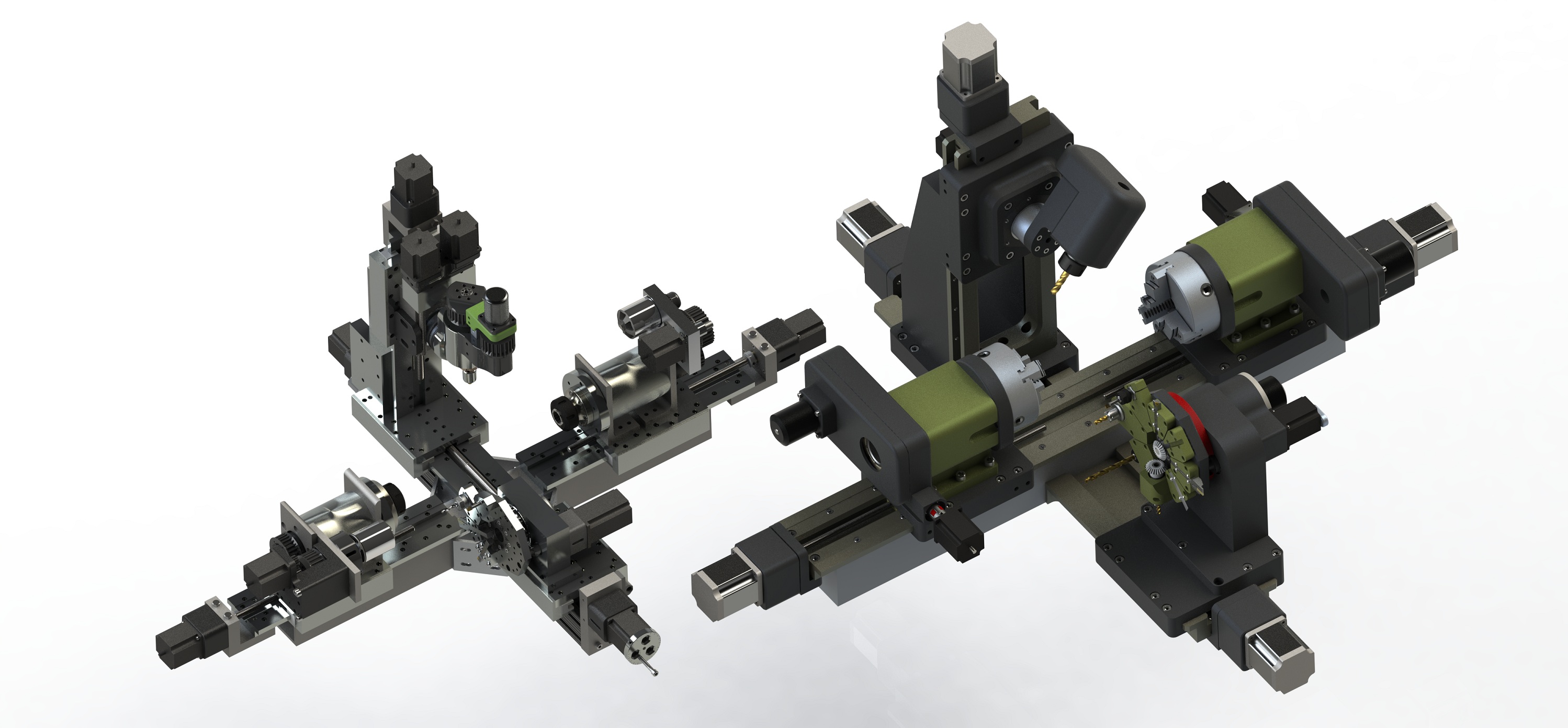 2) The C axis (main workholding spindle) has a clutching mechanism that switches between the BLDC outrunner for regular turning/drilling operations, and a 4:1 geared down stepper for tapping and threading and indexing for milling and stuff. It's great for small parts, but anything over 1" (25mm) is at risk of backdriving the stepper during heavy cuts. I have a completely different design for V2 of the machine that will be improved in every way.