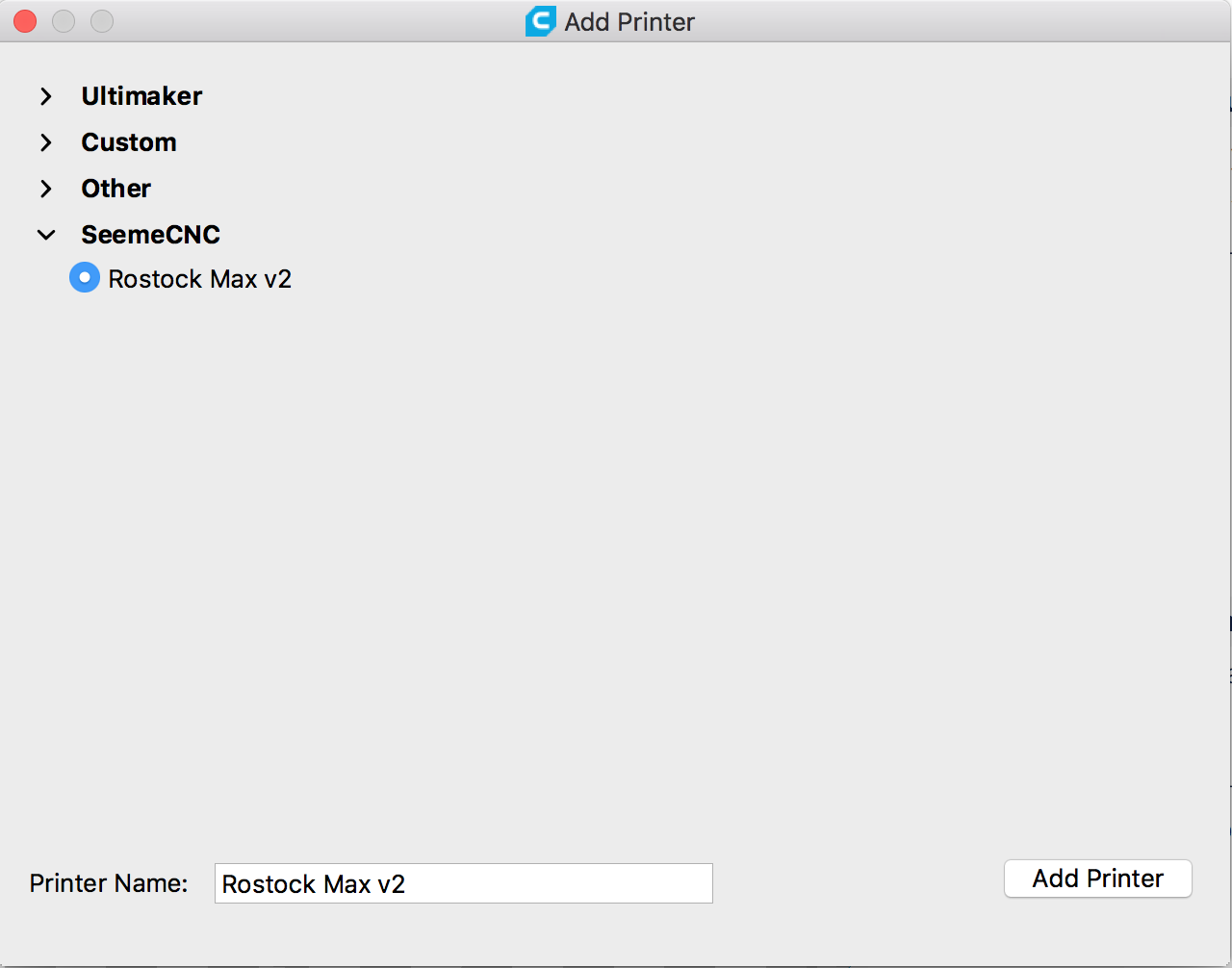 5. Start up Cura and select the Rostock max v2 from the printer select screen