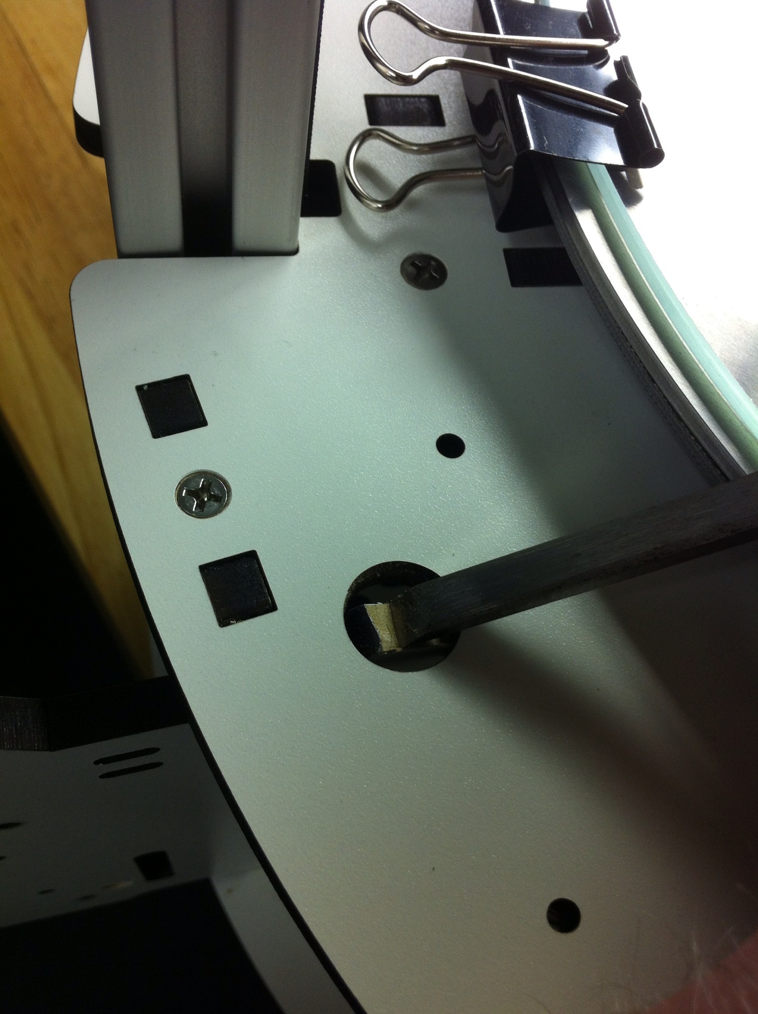 The aluminum plate was screwed on right on top of the Onyx, so I put a layer of polyamide tape on the bottom of the plate to keep from shorting out the Onyx. I soaked two pieces of 8" wide tape in water for a few hours, then slid them onto the plate, let them dry, and trimmed the edges. You can barely see the butt joint between the pieces a couple inches to the right of the hole at the closest edge of the plate.