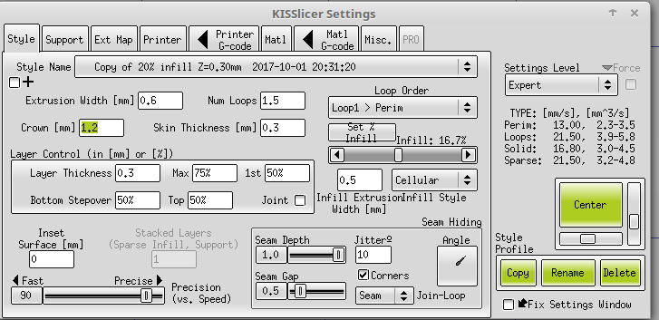 I'm new to KISS since 1.6.1, and am trying to figure out how to close up the gaps in the top & bottom surfaces. I've tried changing the extrusion multiplier ("flow tweak") from 0.9 - 1.0, the extrusion width 0.60 - 0.66 (0.60 nozzle), and the infill extrusion width from 0.72 - 0.60.
