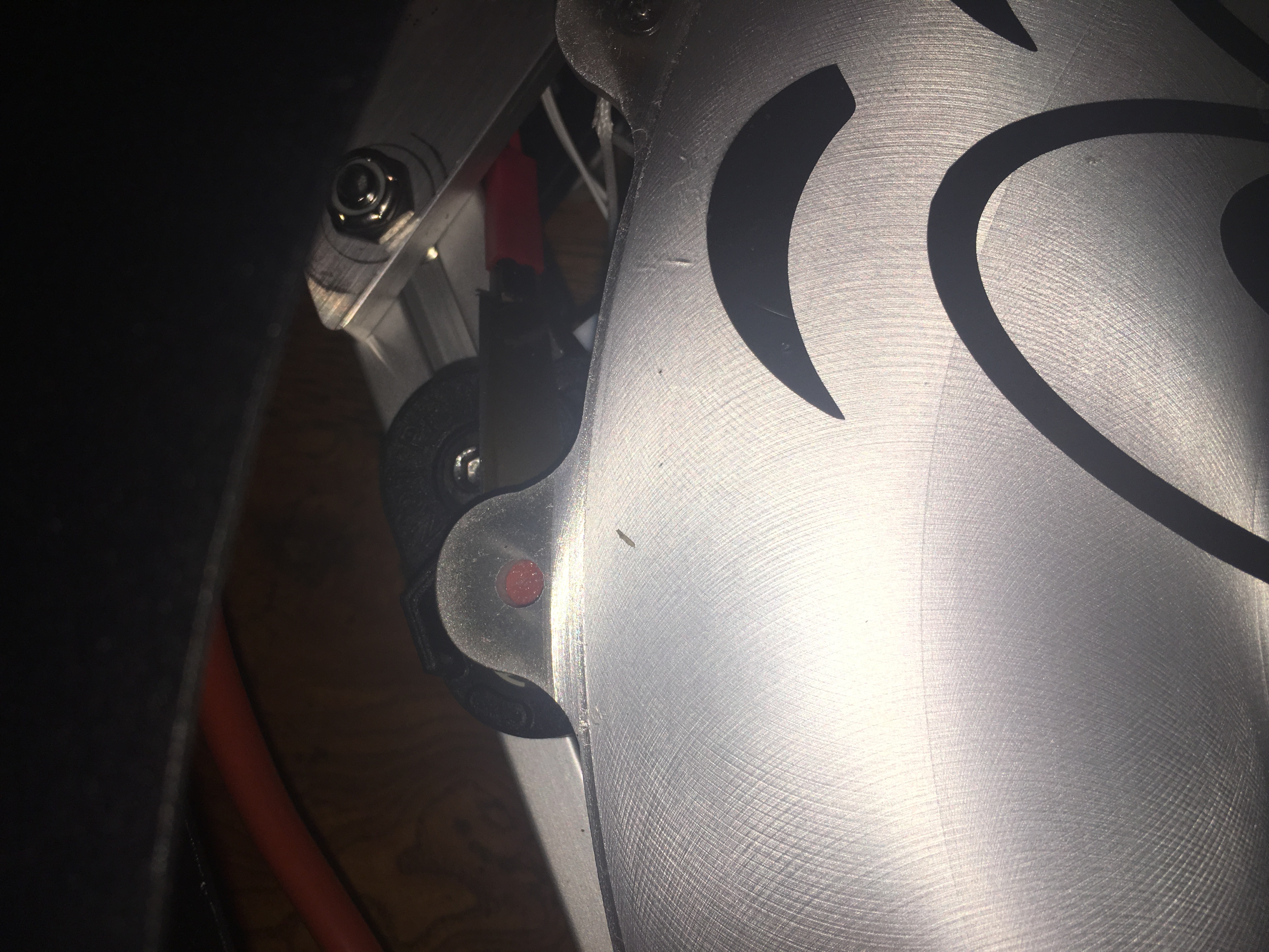 I put the big guy on it's side on the table so I could see the bottom and took some pictures of what I could: The others had their cables neatly flat on the 8020, and out of heat's way. This guy (on the problem tower, pretty sure it's the Y, have to keep looking it up) was curled up and flat against the underside of the bed heater.