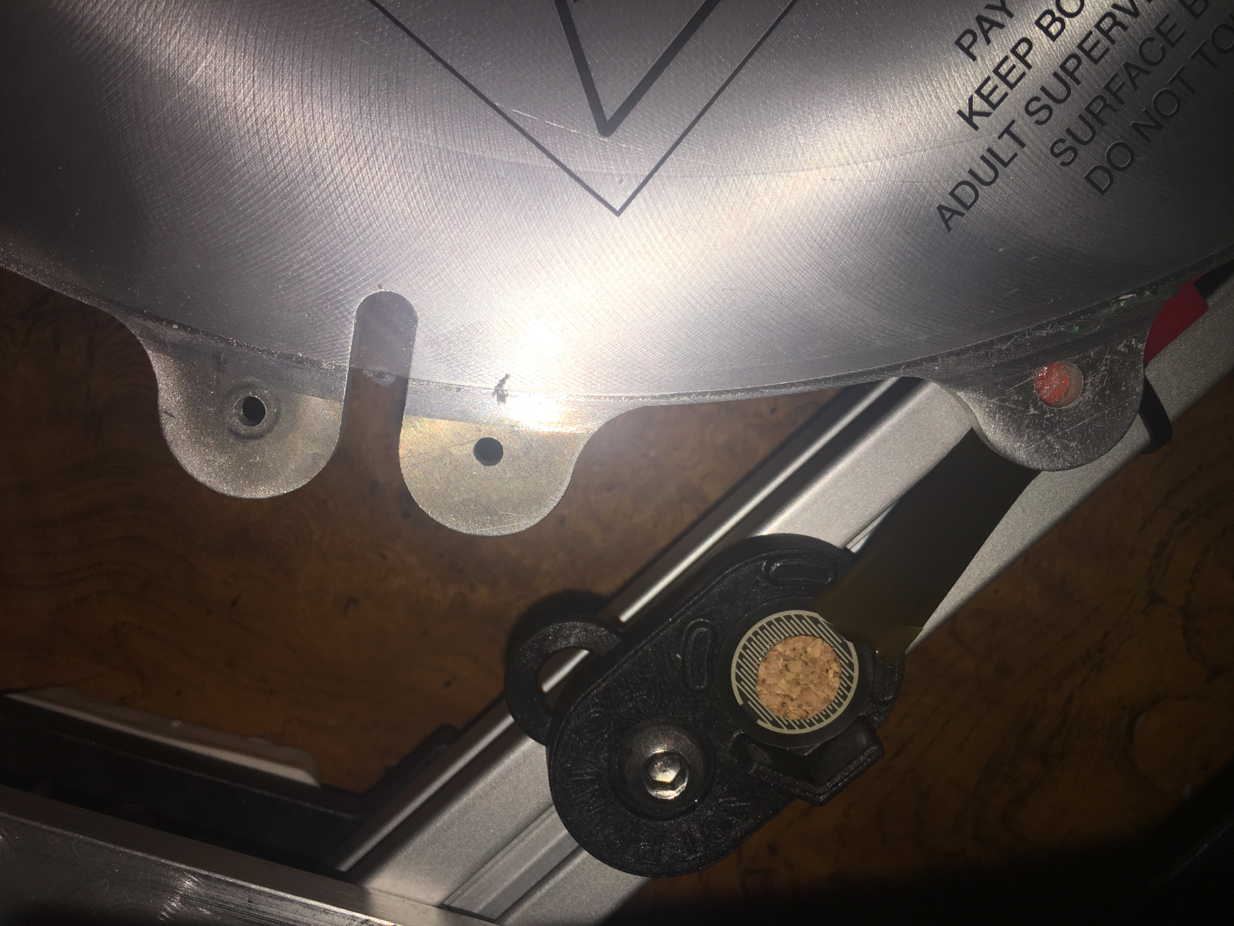 I put the big guy on it's side on the table so I could see the bottom and took some pictures of what I could: The others had their cables neatly flat on the 8020, and out of heat's way. This guy (on the problem tower, pretty sure it's the Y, have to keep looking it up) was curled up and flat against the underside of the bed heater.