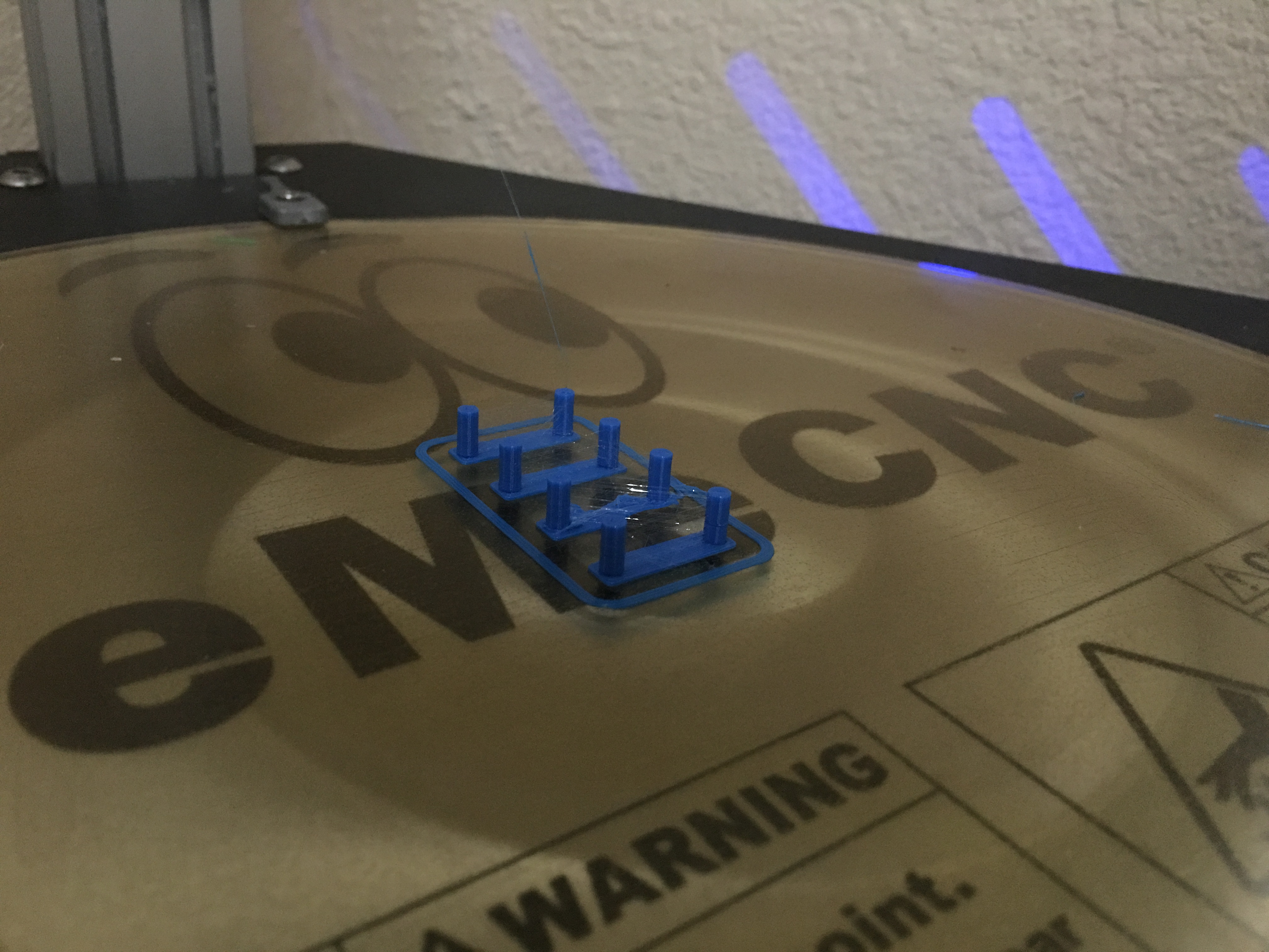 Did it real quick just now. I had to slow it down to 50% for the first layer. Didn't want to stick. You can see the almost completely failed first set there, second from the camera. Added a pic of my shim. That aluminum piece there moved quite a bit and even dislodged the makeshift shim during print so I doubled it up and restuck it.