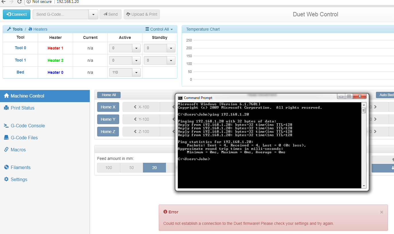 3) Duet Web Control dropping out and not reconnecting until USB cable is removed.