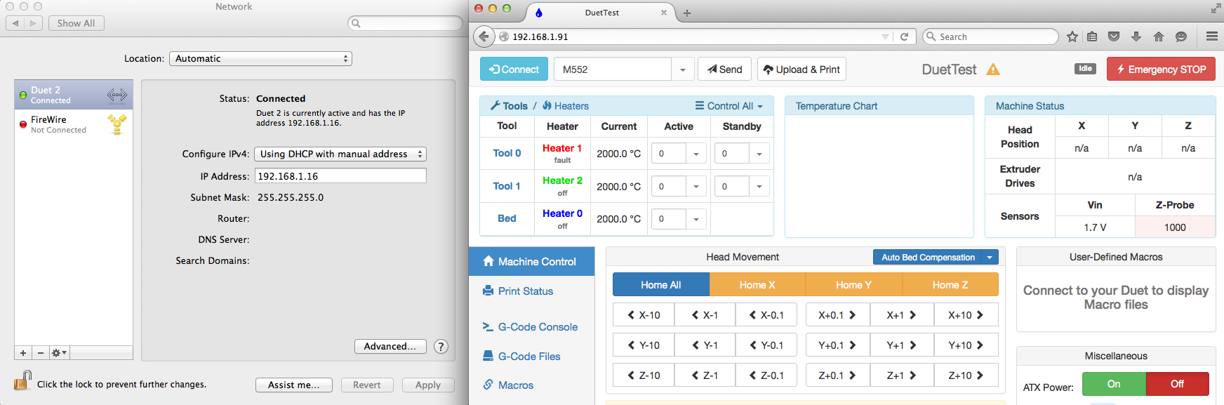 And Changed the Ethernet settings in the SD/macros/g-code.g file - to work with my Mac (MacPro 3.1 Mavericks)