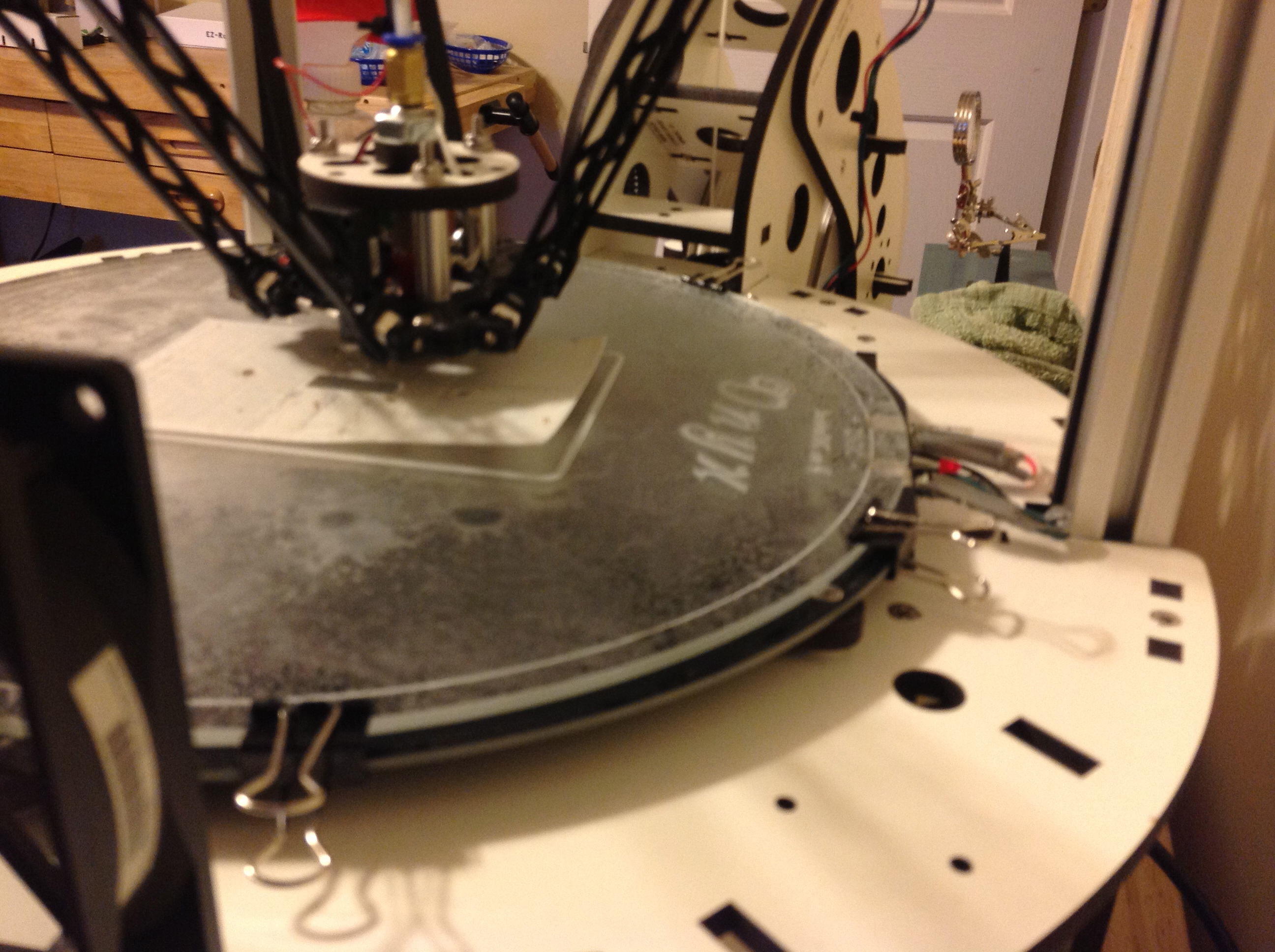 I started printing the first blade of the fan but had to kill the job when about half way through both ends detached from the glass and the nozzle just pushed what had printed around the bed.