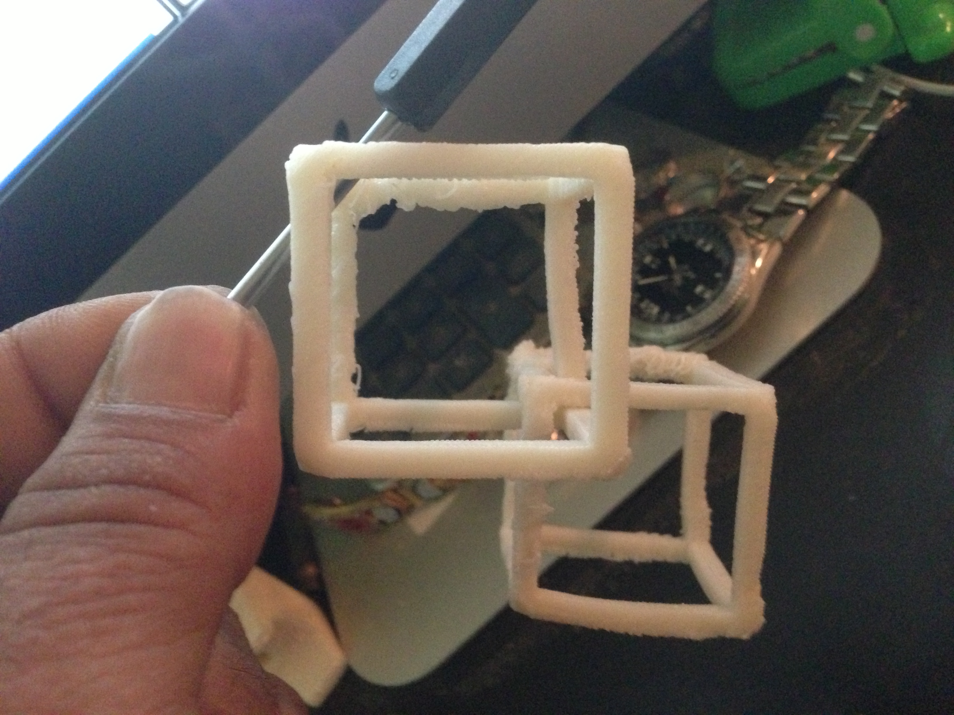 My attempt at Intersecting cubes with the Rostock Max. I know they didn't come out perfect but at least it finished out. I am anxiously awaiting XN's Magnetic arm set up. I am sure these arms will improve print quality significantly.