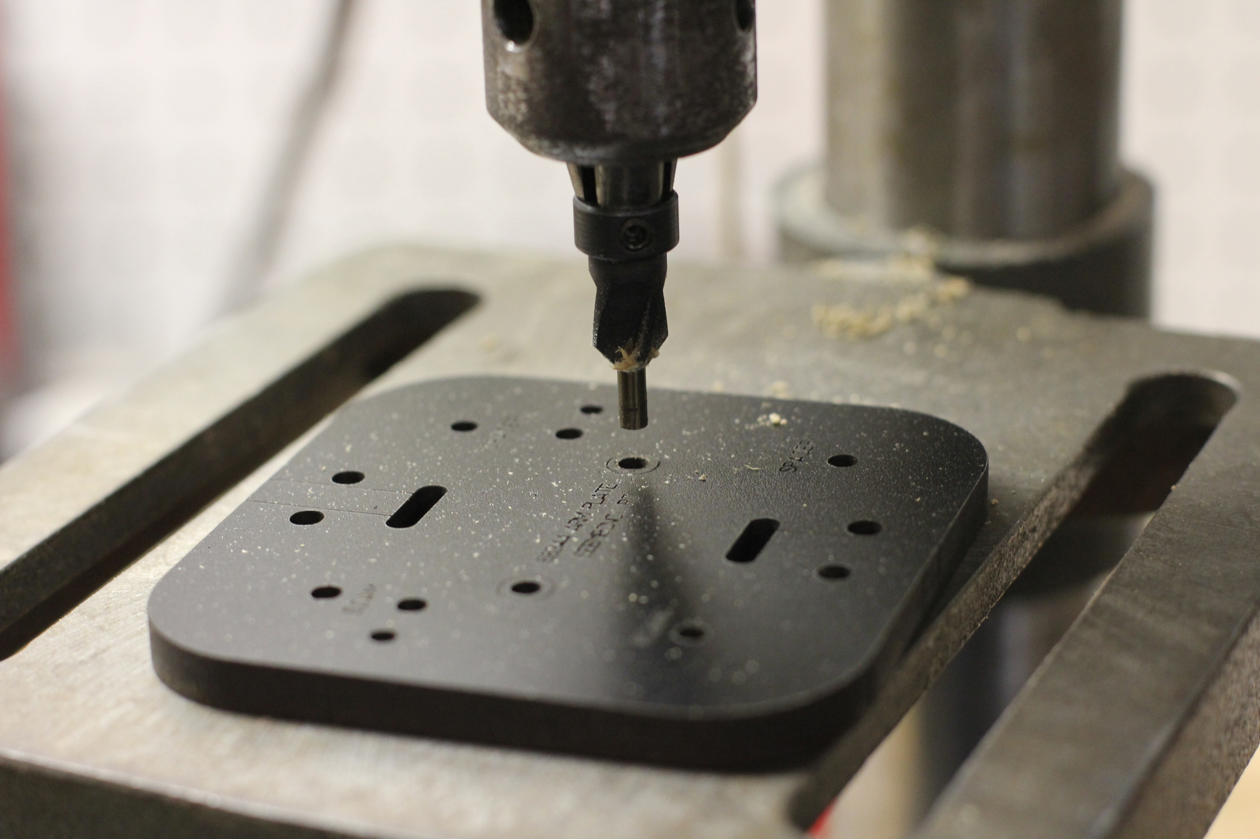 To start with, I used a drill press and countersink bit to countersink all the holes instead of snapping the melamine disk out. One of my tape pulling friends suggested turning the drill bit upside down. That way, the smooth shaft goes into the existing hole and does not remove any more material. Here's the countersink stub.