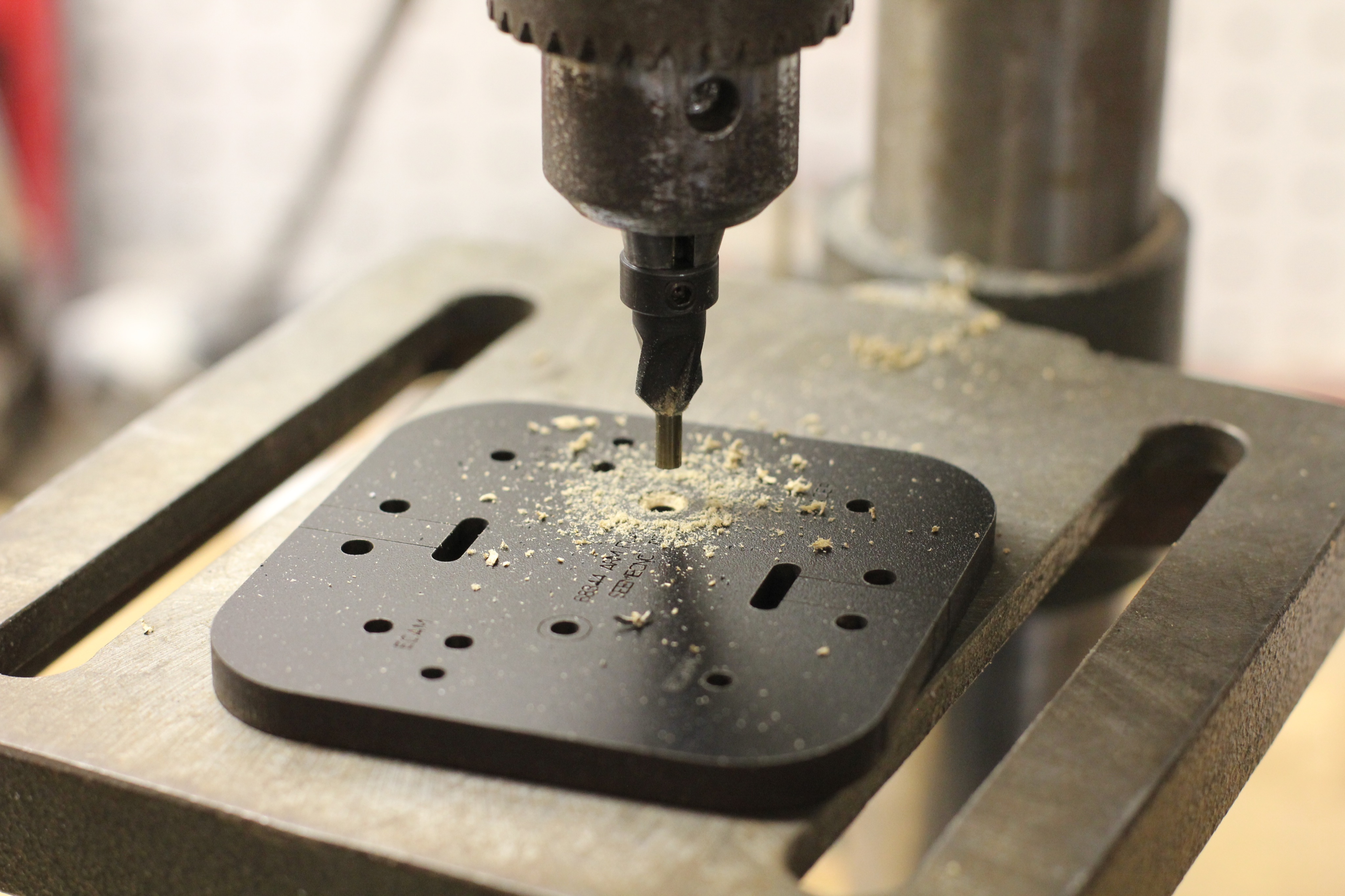 To start with, I used a drill press and countersink bit to countersink all the holes instead of snapping the melamine disk out. One of my tape pulling friends suggested turning the drill bit upside down. That way, the smooth shaft goes into the existing hole and does not remove any more material. Here's the countersink stub.