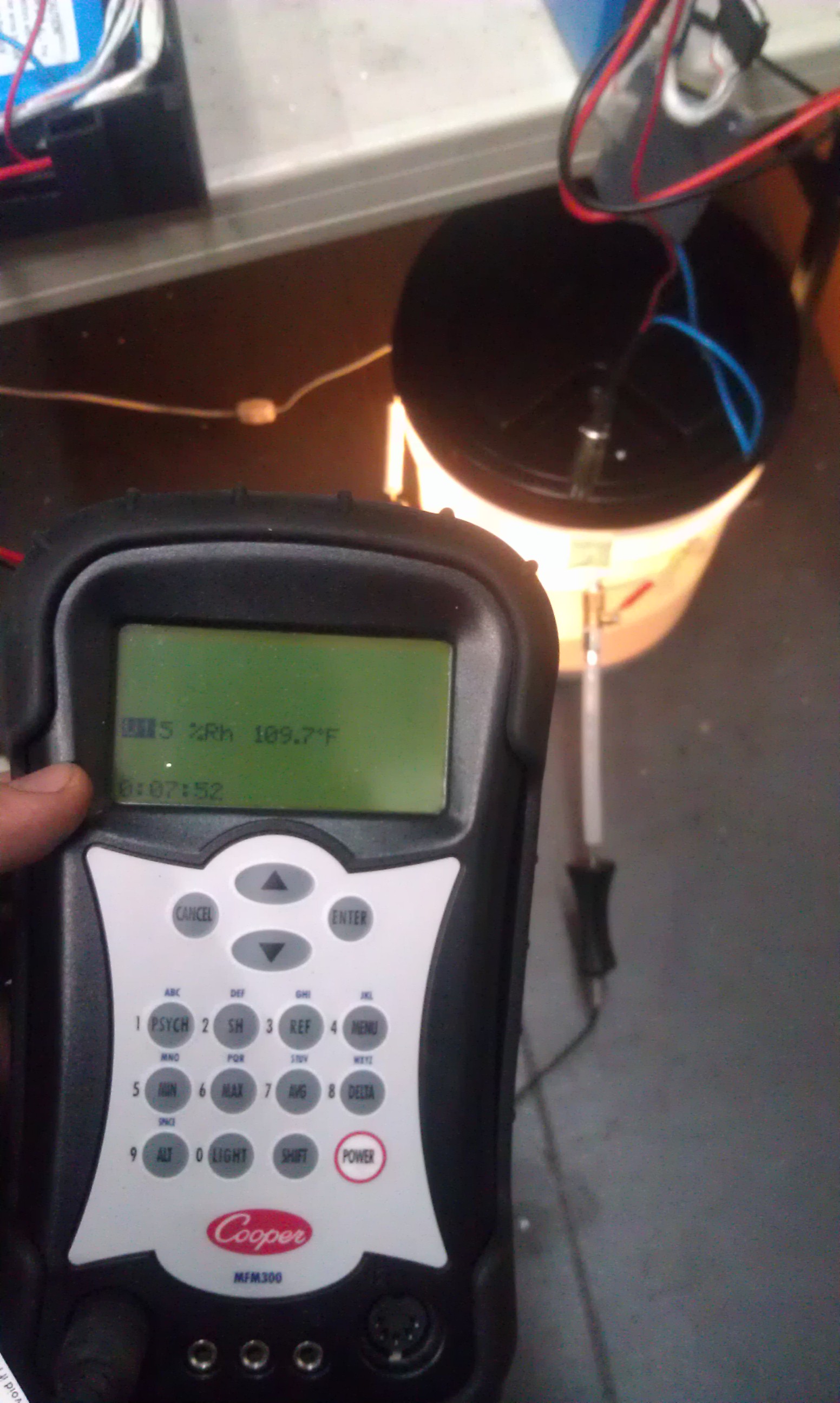 Sample 3 - airtight bucket with desiccant, heated and compressed air flow through the bucket at 3psi, 40w incandescent bulb. PID controlled compressed air heater set to 130F - once up to temp, air would kick on every 30-40minutes or so and would take about 6-8 minutes to turn back off.
