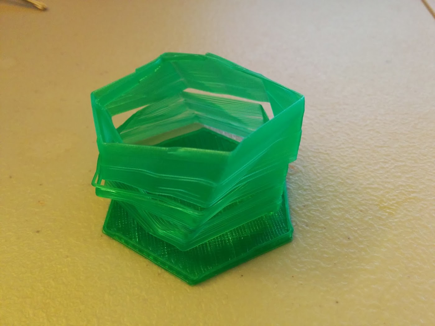 I just can't seem to figure out how to get it more consistent. The problem seems to occur about 1/4 of the way through the print. As I said, Single-walled prints are my only success at this point. Anything with infill or more than one perimeter is what's throwing me troubles. That makes me feel like my problem is related to retraction causing some sort of buildup over the period of the print. I'm running 30mm/s speeds. My heated bed is at 75, hotend is at 215-220, .375 layer height (have tried .45), I'm retracting 2-4mm and am not home right now to check my retraction speeds. If I don't find success in the next day I think I'll setup my PEEK fan to see if that's the issue. I didn't think I'd need to based on what the guys at Taulman told me about the material and that they print long print long prints without problems with no fan on the stock seeme. Hope the extra info helps.