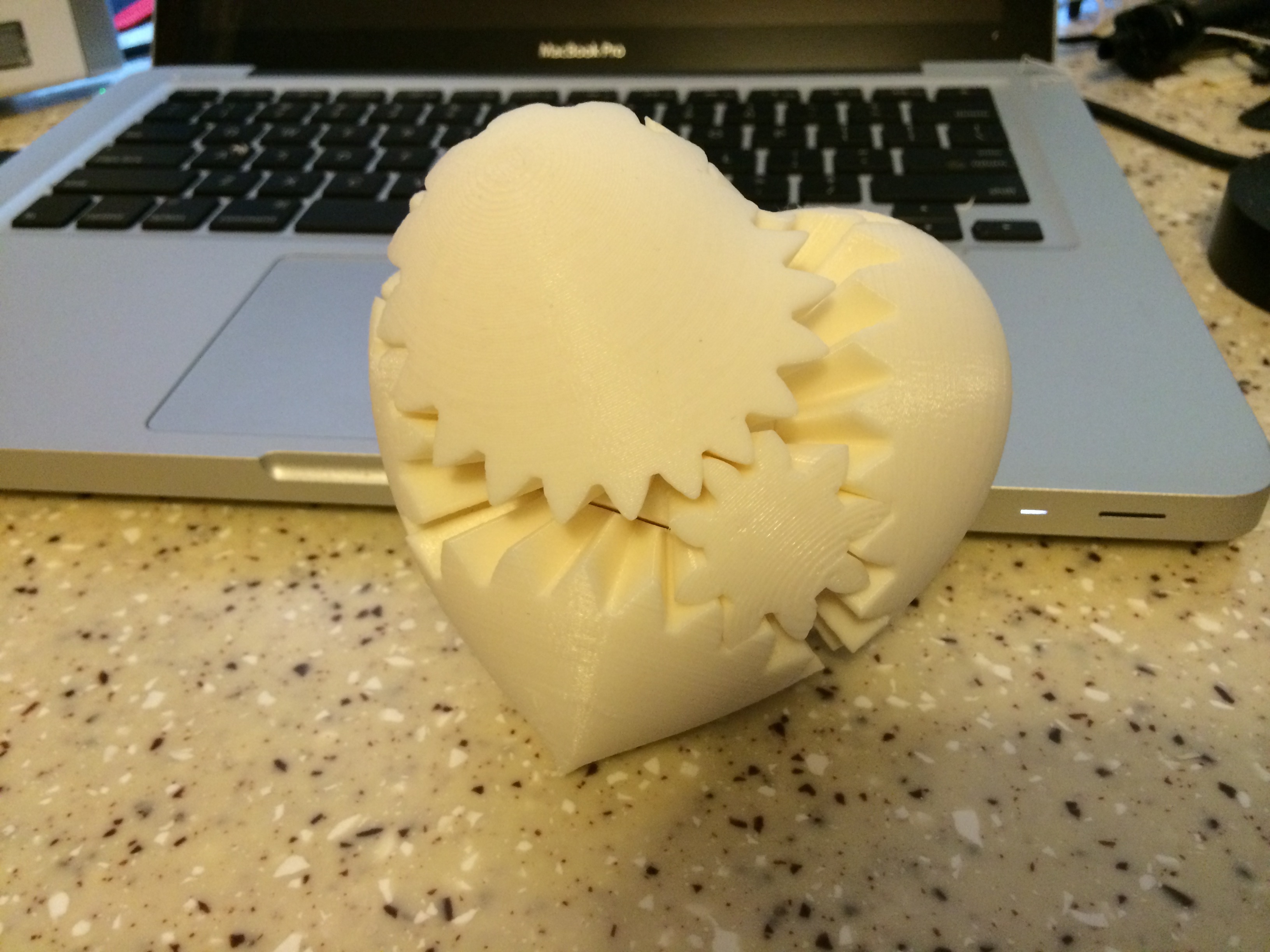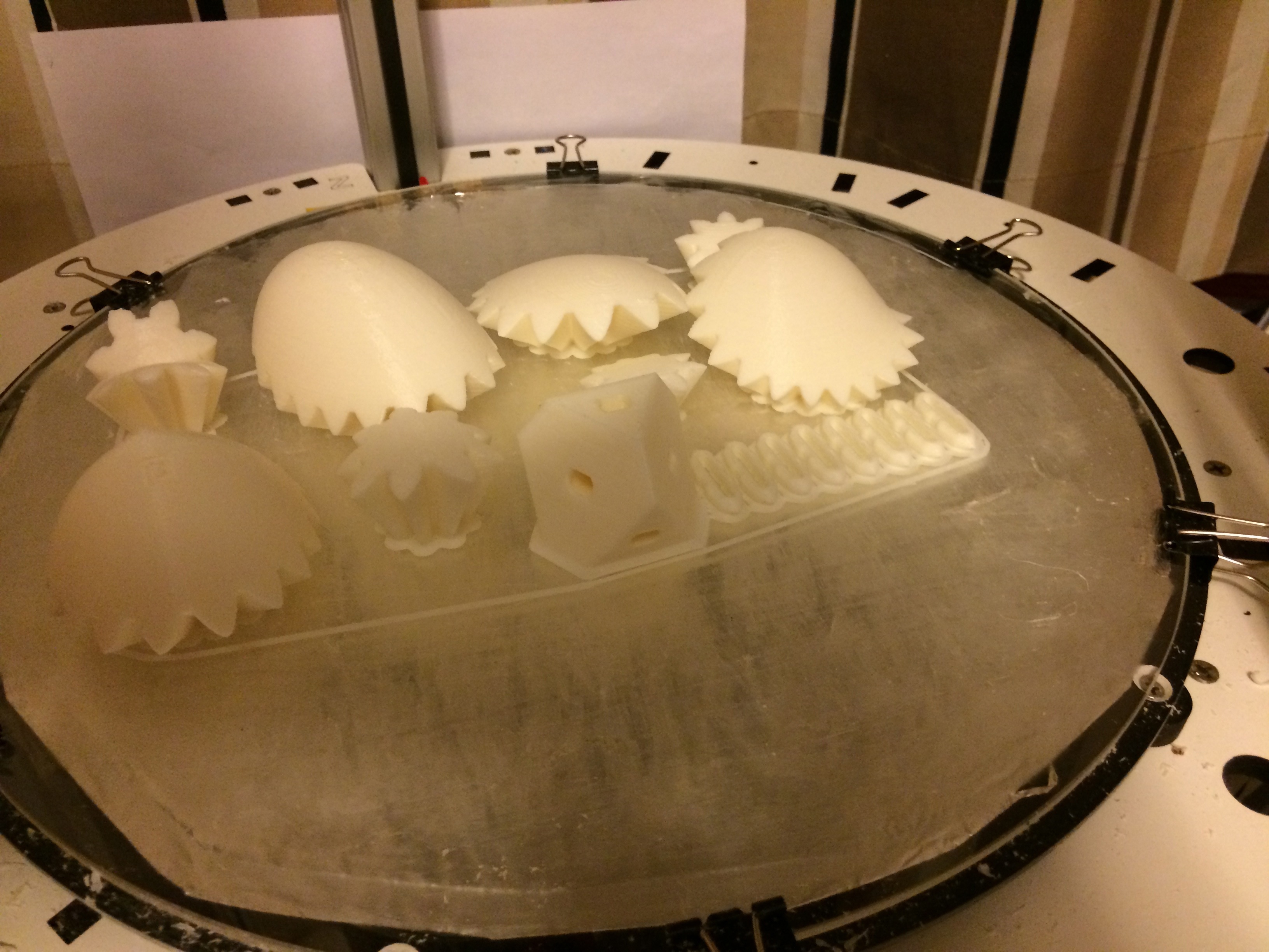 I printed in White ABS (Jet, ordered from Amazon) at 240C with an E3D, 0.4mm nozzle and Gluestick on 100C bed. Here are my slicing parameters if anyone's interested. Note that I increased the speed multiplier to 150% after about 5 hours of printing and then I increased it to 200% after about 7.5 hours of printing. I'm not sure how long it actually took because I went to bed
