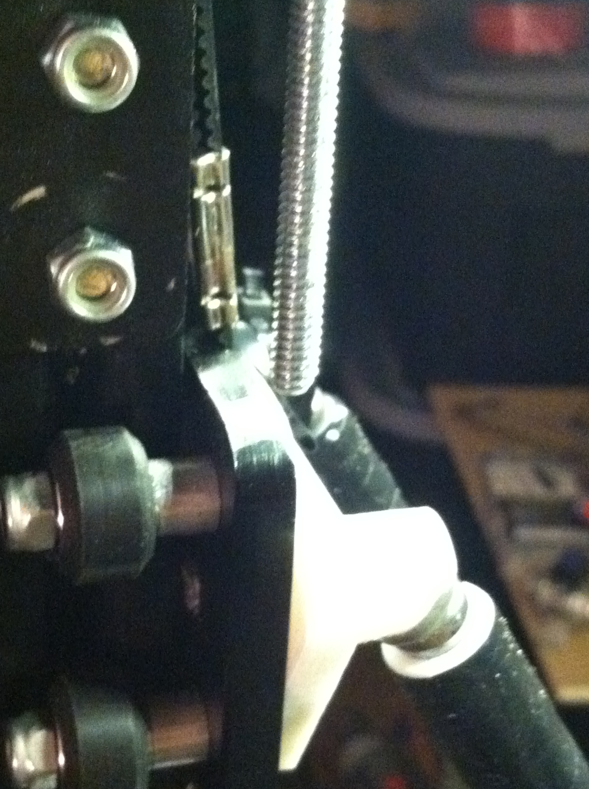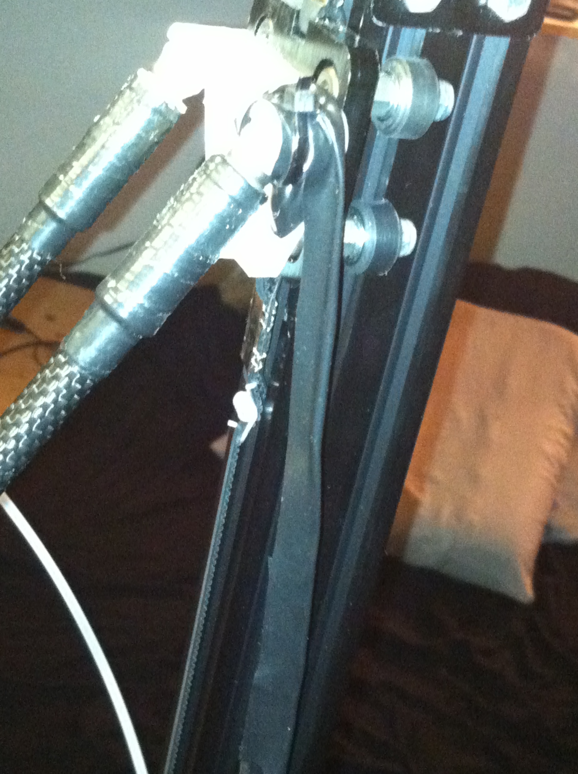 After that worked well i decided to apply the same idea to the linear carriages. I ran a all thread rod through the roof and soldered a positive wire to the threaded insert. Then I attached the negative wire under the phillips mounting screw. I had to file off the anodize around the contact area to close the connection. The wires are a little unsightly atm, but I'm gonna clean it up after it starts performing.