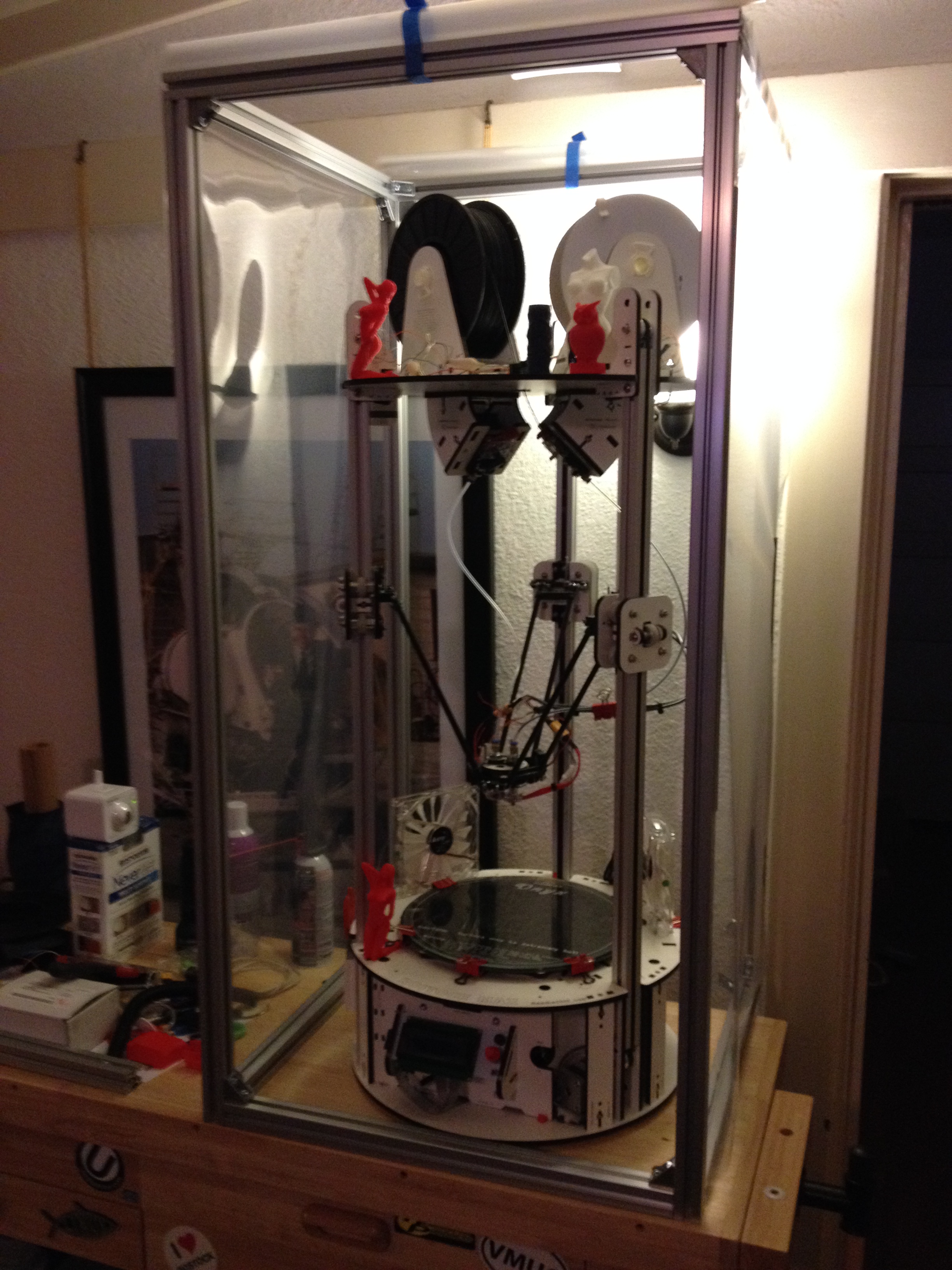 The "chamber" that several people have used enclosed the entire printer from the bed to the top but you raise some valid questions like the peek fan, etc.Shizuma wrote:I've almost finished my Rostock MAX, just waiting for my kapton tape and ptfe tubing for the hot end resistors to come in and then I can start calibrating, in the mean time I've been thinking about a design for a heated build chamber. I want to build a chamber to be able to heat up to the 70-80C range I've read was recommended for large abs prints. One thing I was wondering about is the heat affect on the components, obviously the X, Y, & Z stepper motors and all the electronics are already separated from the build area so no issues there, however I was wondering about the extruder stepper motor, would that have an issue with those temps? Would the peek fan require cool air from outside the the heated print area to not have an issue with printing?
