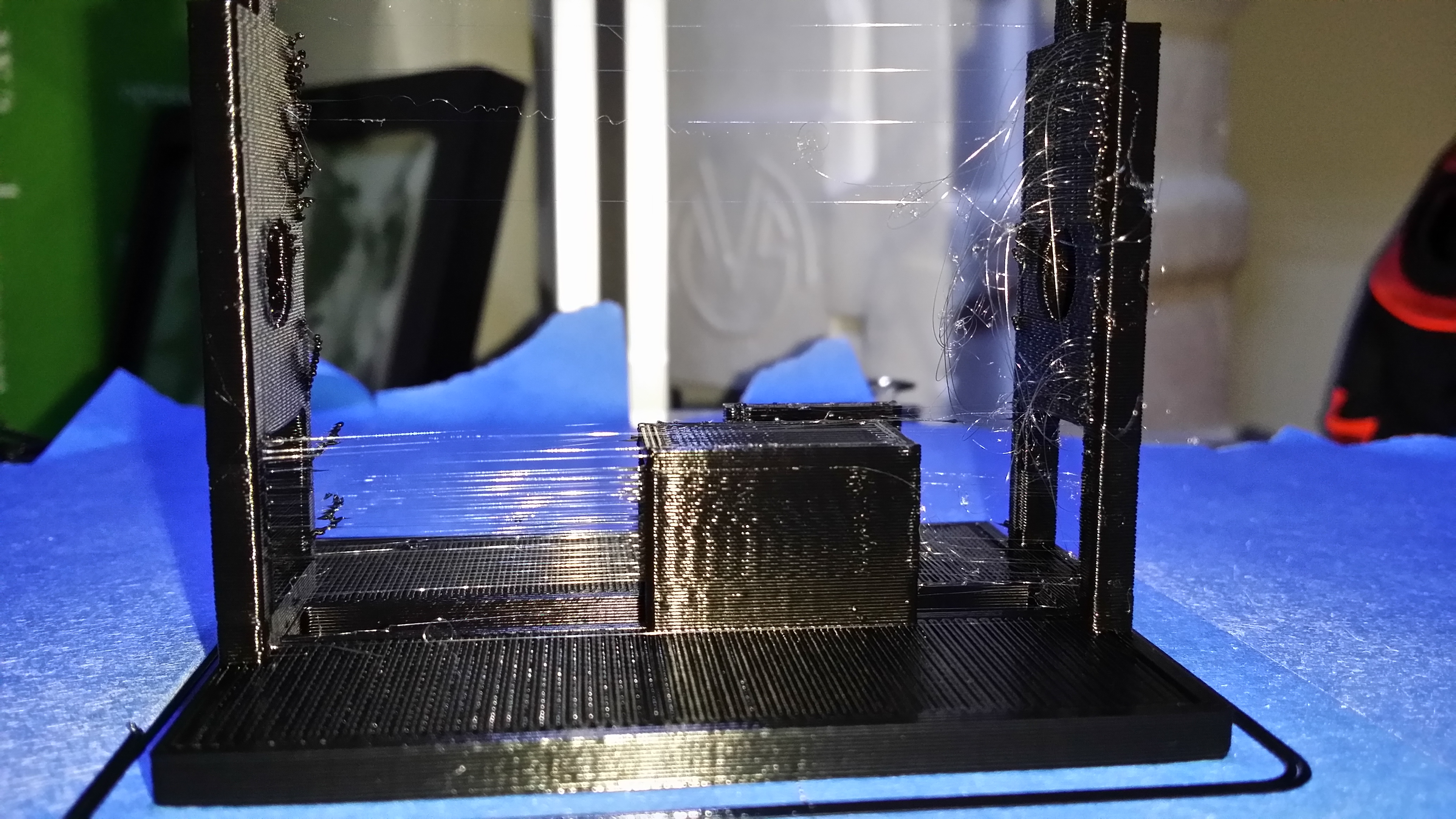 Instead of posting a new thread, I thought I'd try to add to this one! I've got the exact same problems that were mentioned at the beginning of this thread. I get PLA oozing and little blobs and strings all over my print. I'm using PLA and was running it at 195 degrees. I'm using the settings provided by geneb in the manual (all 30mm/s and 80% on external perimeters). I've been experimenting with those speeds a bit too to try and get better results, but they always seem to come out the same. I'm using Slic3r right now (might give Cura a try when I gather up my courage to try something different). I'm printing at 195 and if I go much lower, I end up with skipping on the extruder so I haven't wanted to go too low to avoid a jam. I've also tried different retract settings and wipe with success on smaller prints, but if I have a few things on the build plate or a larger object, I end up with this mess: