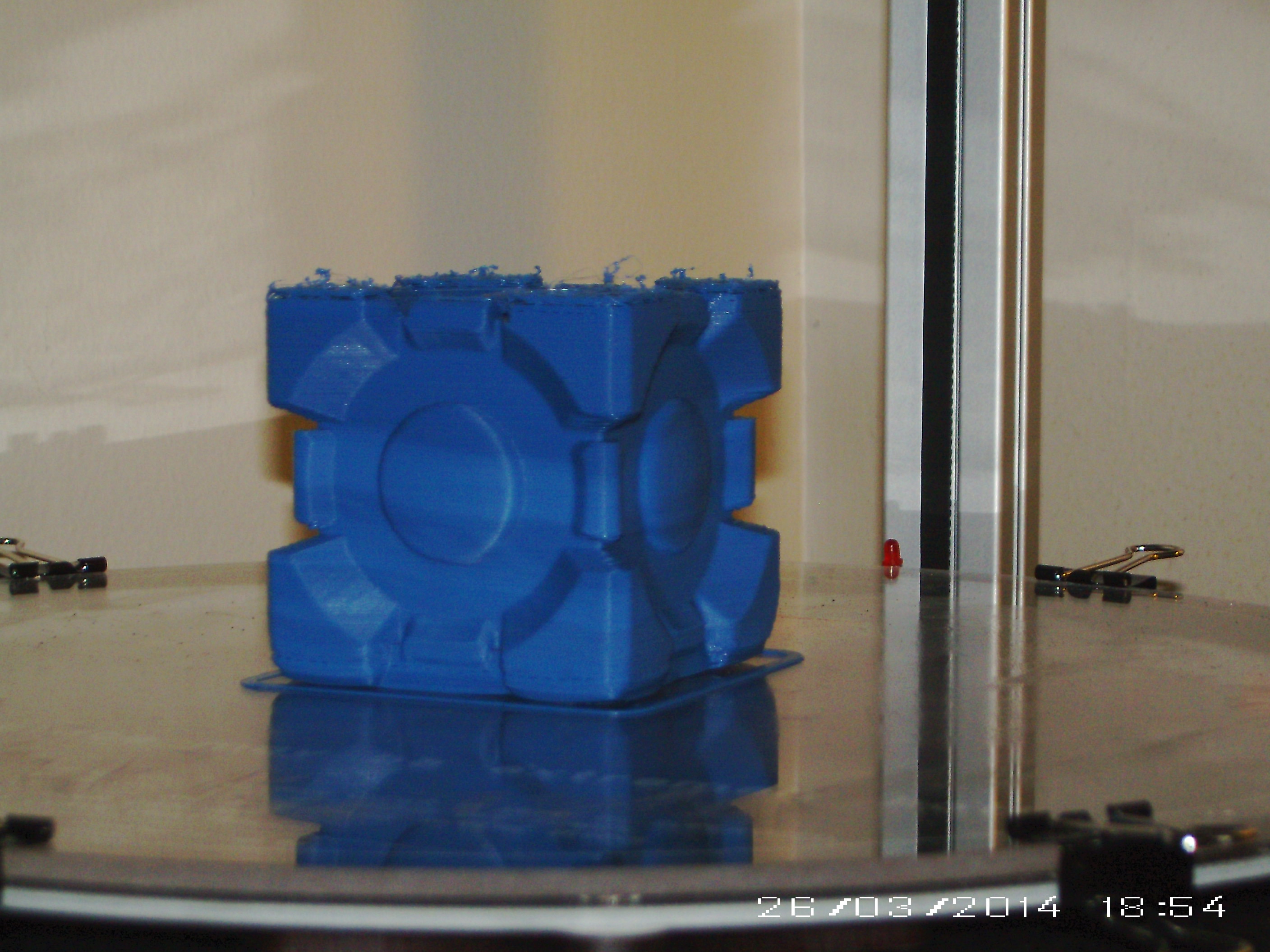 Well the wall finished, it has a line across the middle with very little plastic, and it actually broke in half long ways when I took it off the plate, easy to glue back together though. and it looks stringy.. The crystals worked pretty well for the first 30 or so layers, then one of the back ones is shifted about .5mm to the right, but went back to the original position near the top, and as it went up more of the smaller crystals were shifted to the right, but not all of them. I would have thought the whole model would have shifted of one of the pulleys slipped.