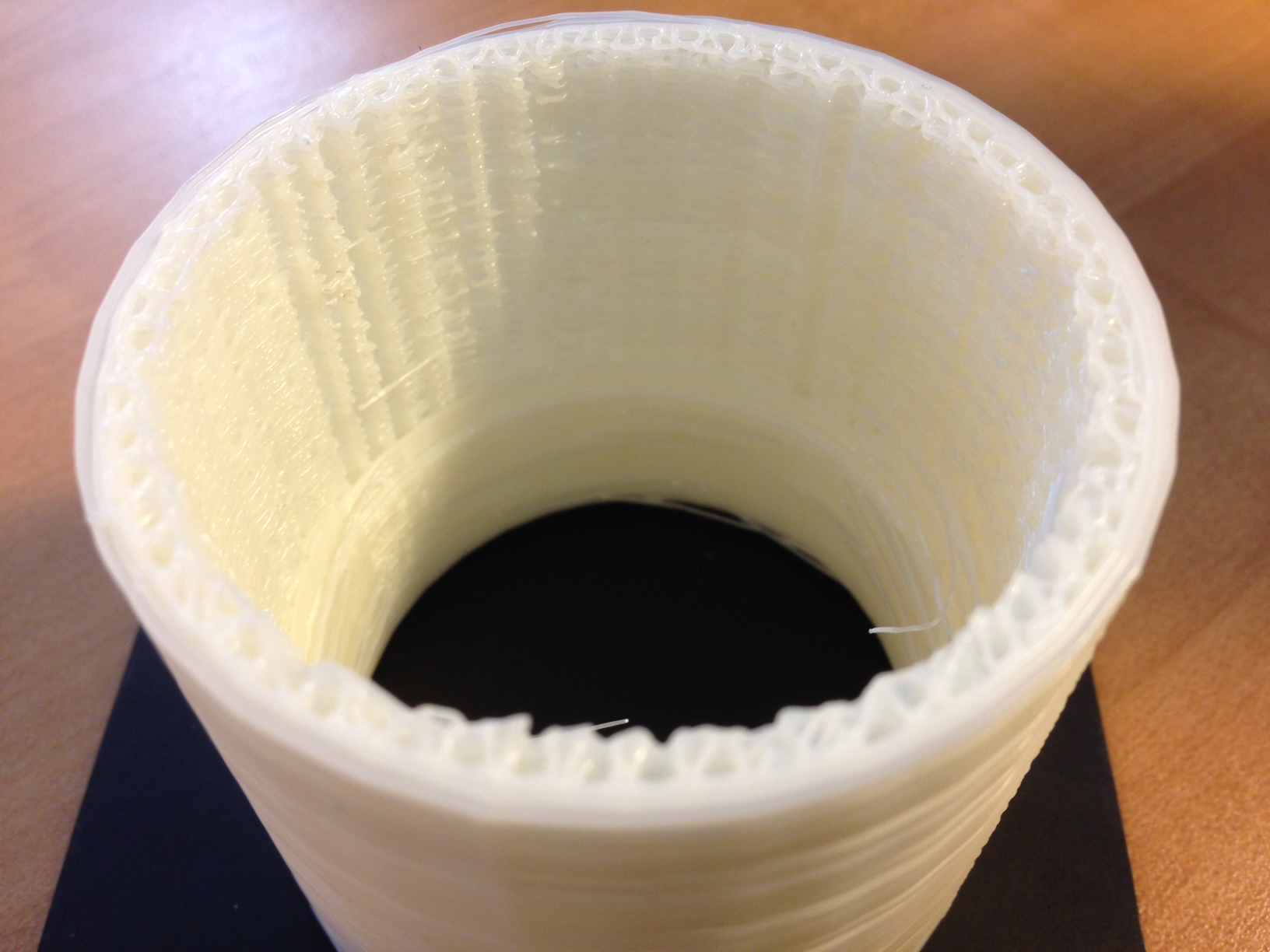 (Worsening delayering and spiderwebbing (inside) as the print gets higher out of the 6" draft shield created from the foam cards which shipped with the kit)