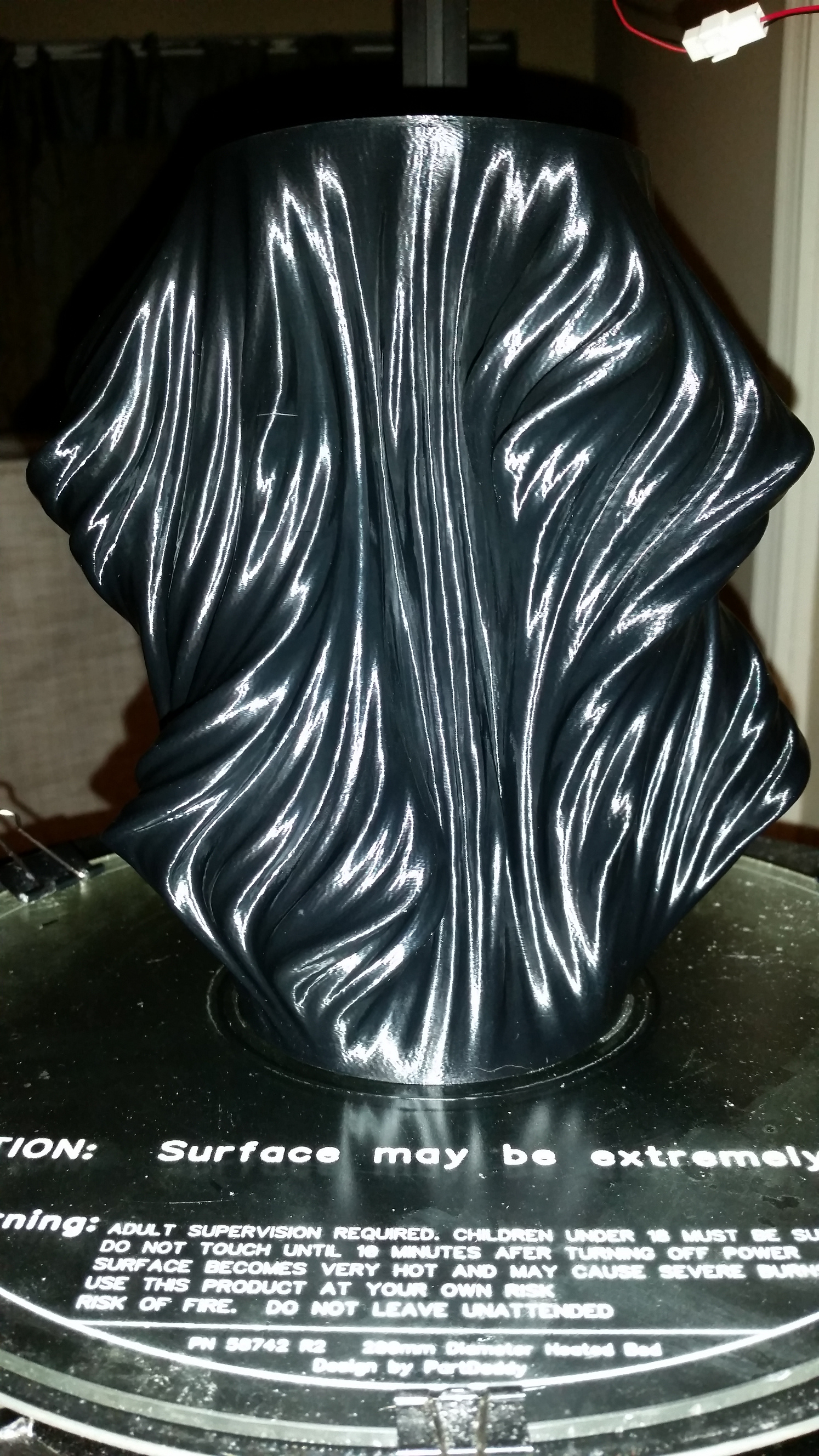 So here's my first print, a heatwave julia vase ( 1.6x increase in size, .2mm layers). I haven't seen a Moiré pattern in the horizontal layers before so I was surprised by that. Only one small bit of layer separation, which bodes well for me since I plan to do an enclose soon. I'm really happy my mods and tear/down rebuild finally got me to satisfactory prints again. I'll have some more things to post Sunday (I hope), it depends on whether or not I get that day off. Anyways, I'll post more about the smoothie settings then as well.