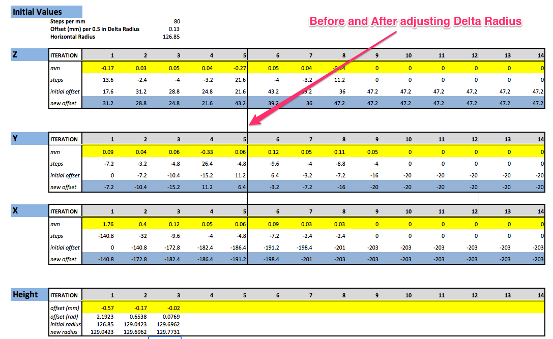 7. Get back to re-calibrate the towers, but this time, you do not need to adjust one by one. You can get the three offset values first, and then enter all of them at once in the EEPROM (remember to invert the sign and to add this value to the original offset value in the EEPROM). You can do it one by one, but if you do it at once you can time.