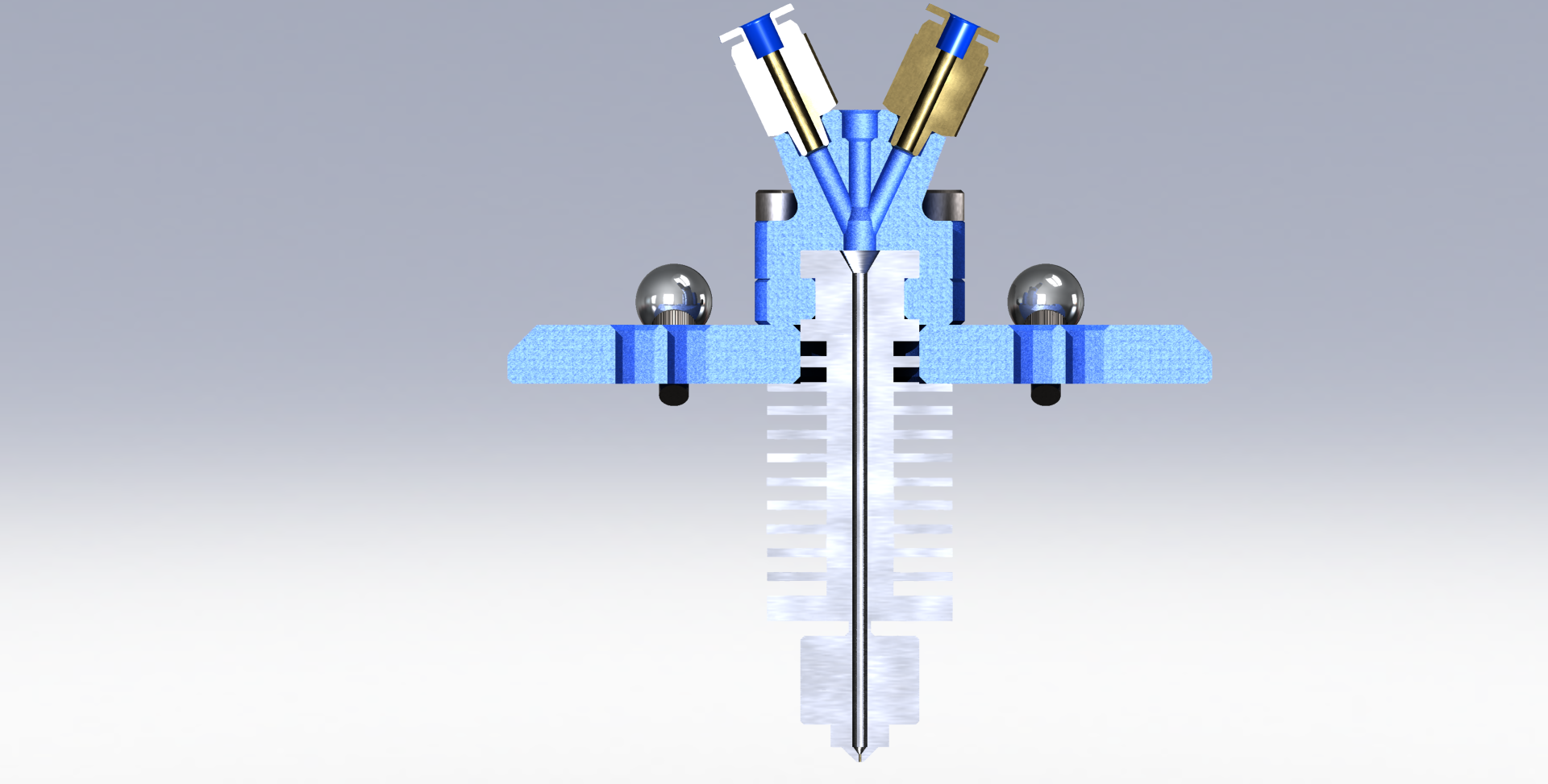 I am interested in your widgets. I assume that you retract the active filament past the biflurcation point and then advance the second filament into the hot end. Also looks like this is fitted to a E3D Hot End.