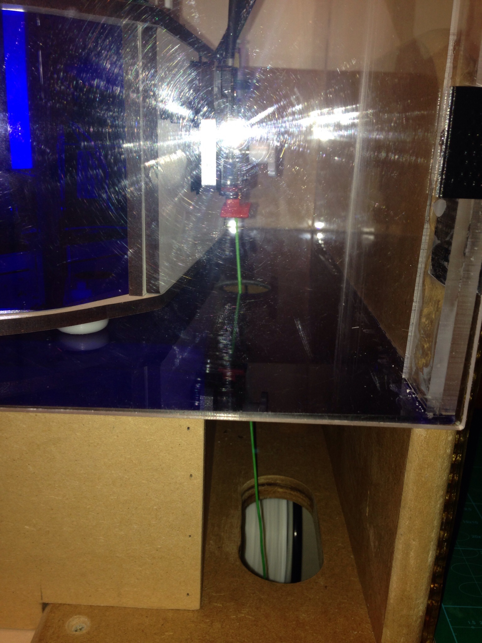 The filament spools from a holder under the "finishing platform" as I like to call it. It then passes through the wood, then acrylic up into the EZStruder. Works really well. I have another spool down there because I can.. Maybe hopes for a dual extrudes mod!