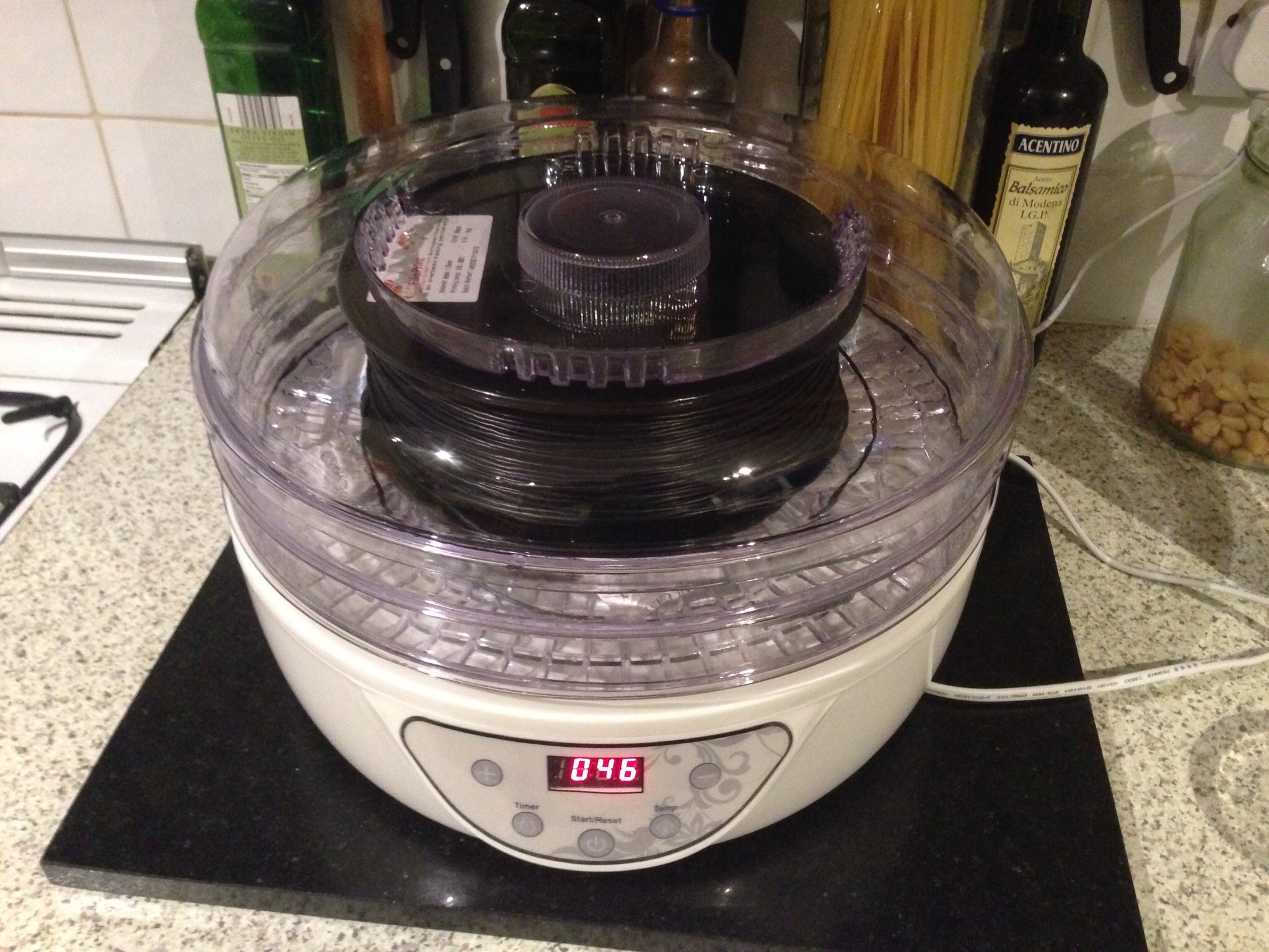 I've had trouble printing some nylon and that was partly due to the moisture in it. I was reading that curing it in the oven for 10 hours works but frankly I don't want to have an oven on for that long due to gas prices and fire hazard. So I went and got a fruit dehydrator (used to dry fruits) and from the feel of the filament it looks like it's worked quite well.