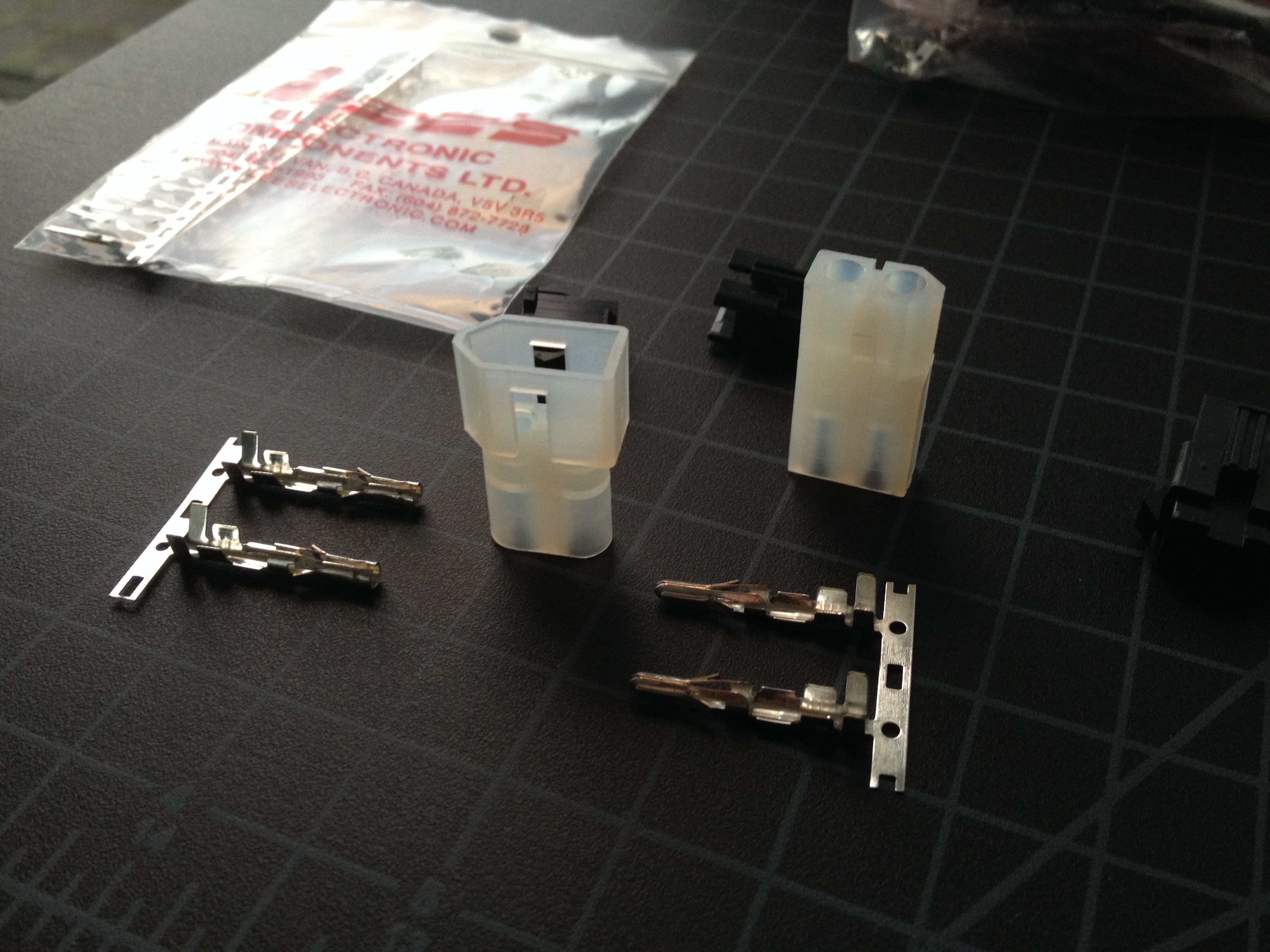 So I decided to go with a separate large two-pin connector for the resistor heaters and a smaller two-pin for the thermistor. Mostly for reasons of wire gauge. I decided to go with smaller 22g wire for the hot end thermistor instead of the supplied 18g.