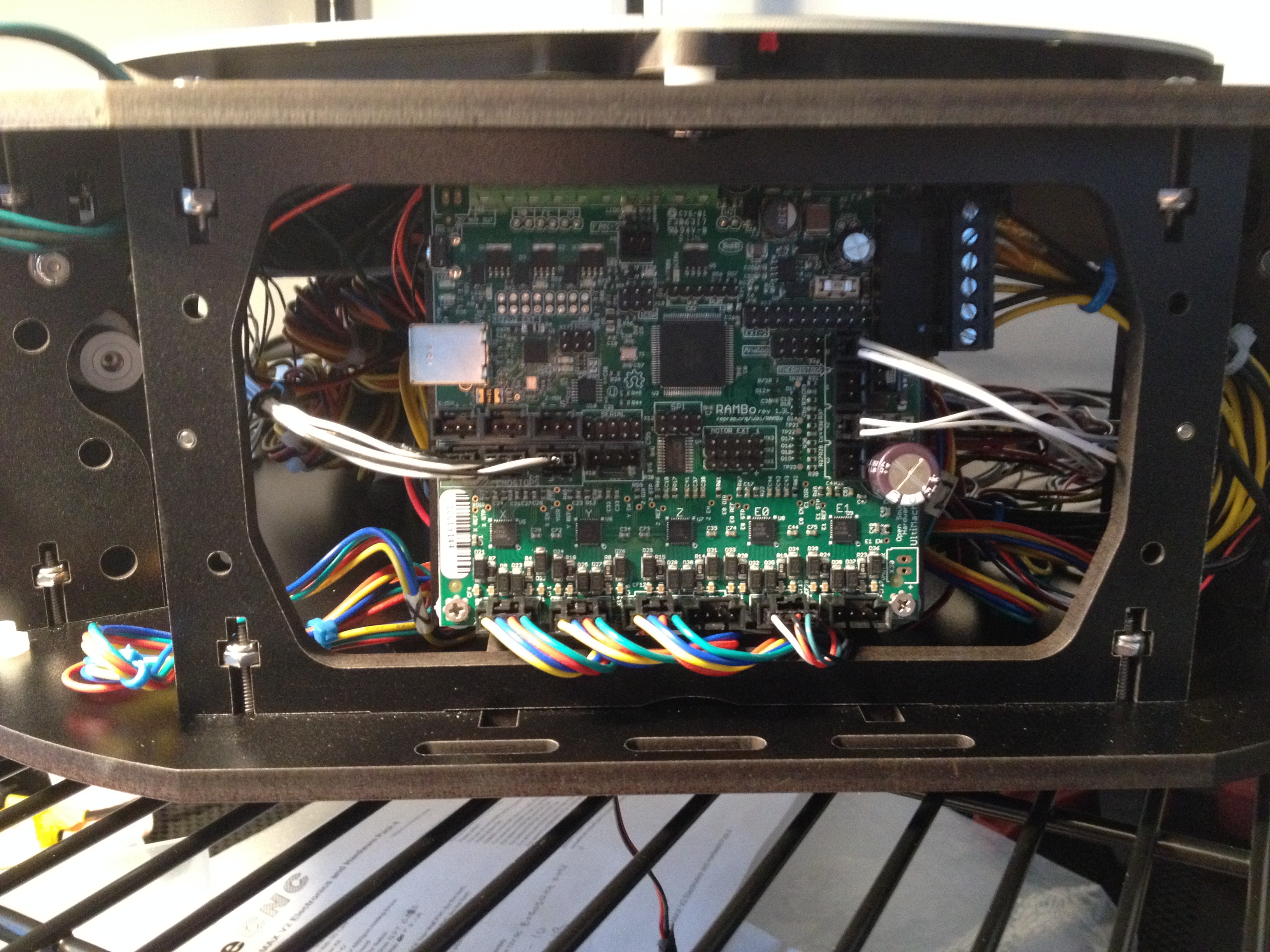 Cleaning up some wiring here. I decided to run all the fans directly from the PSU with these fancy IDE power fan adapter gizmos. You can see them marked "fan" if you look closely. This way the two chassis fans and the rambo fan will be plug and play. Easy to replace, no soldering, less power going through the Rambo (1 amp less).