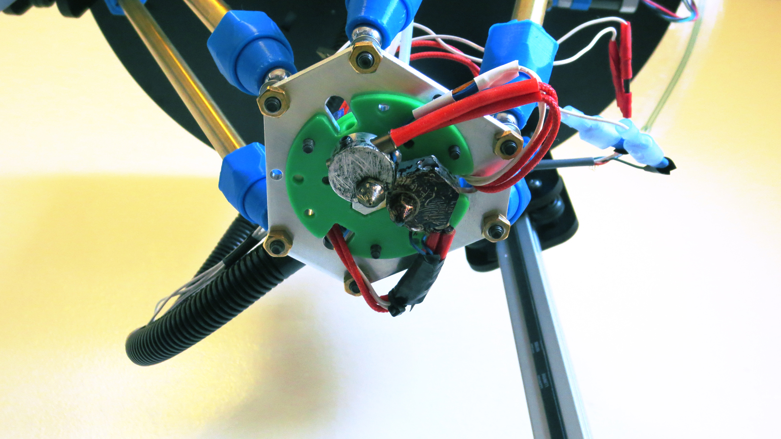 I recently decided to start selling the hotend in one or two nozzle kits as well as the full Tri kit (mono and duo kits, respectively). The first two photos are of the hotend mounted on a custom milled aluminum effector plate on the Rostock Max with magnetic arms. Only two of the heater blocks are installed, I was testing the Duo kit with a the older hexagon heater block and a different brand of nozzle. The Tri hotend is compatible with most M6 nozzles. Both of the nozzles in the picture are not coated with WS2; notice how crusty they get after crashing into a print from defective end gcode!