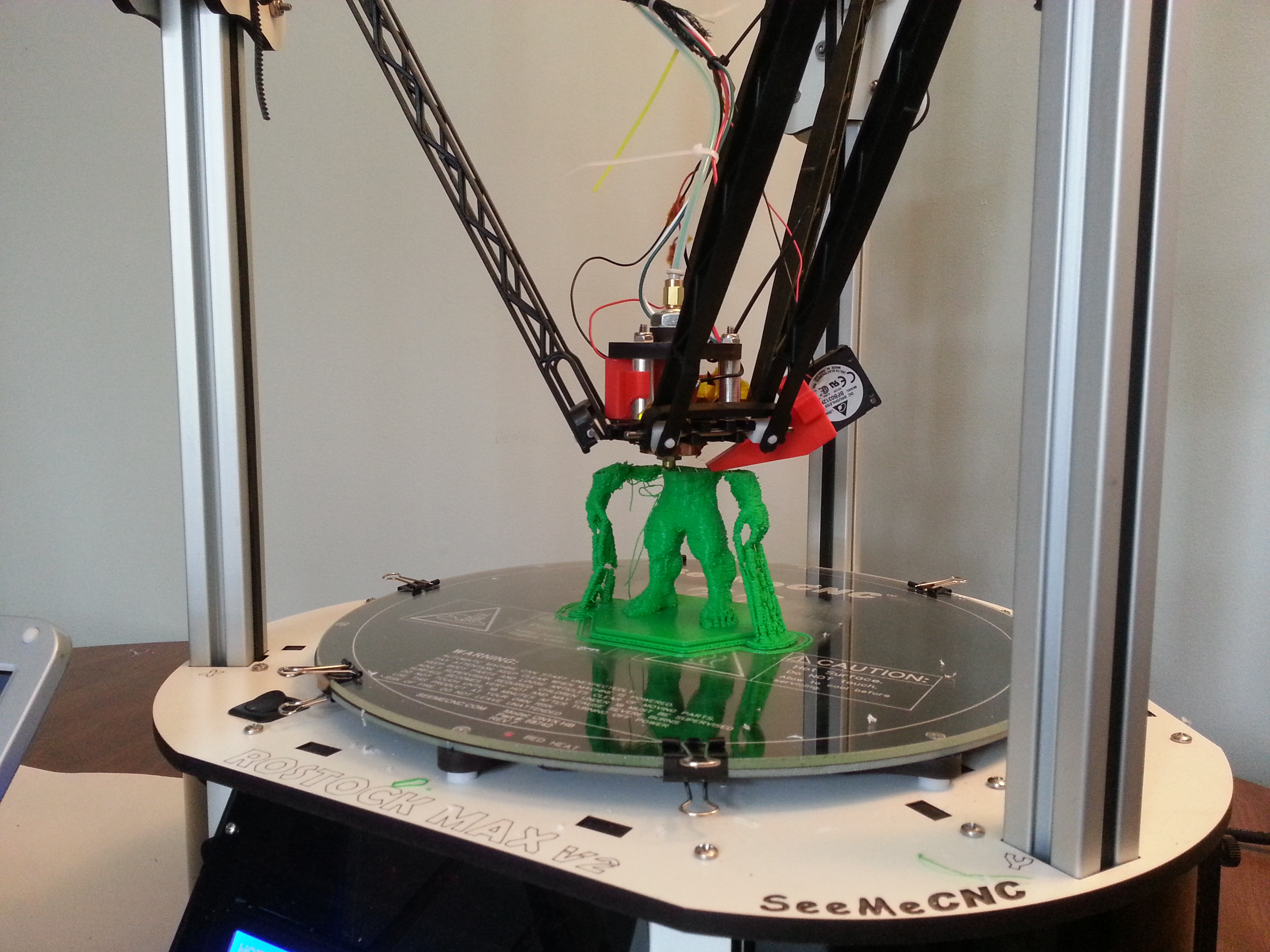 This was my first "big print" that ran more than an hour or so and also was a more complex object than the fan shrouds. I downloaded this object http://www.thingiverse.com/thing:576209 and used the default settings for MatterControl printing PLA downloaded from the SeeMeCNC site. I did have a 2mm raft and create support material enabled. Though I don't think that it generated and extra supports.