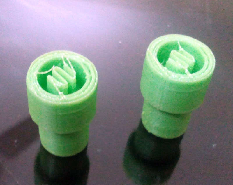 When you do determine you have a problem that only a fan can solve, start conservatively. I also seriously recommend using a duct of some sort to focus the air flow where you need it. Ideally, the fan would have the ability to follow the print nozzle and direct a small stream of air to the filament right after it is laid down. That is a difficult problem to solve, so most of us direct the air to area around and under the nozzle. But, by directing the air (duct) you can reduce the air flow significantly since it is now focused where you need it. Here is an example of some of my fan research. The part on the left failed (in a previous run) as you can see due to warping caused by an uneducated 25mm inducted fan blowing at 50%. The part bing printed on the right was my first attempt at using flexible soda straws (2 of them) to direct the air flow to exactly where I needed it. I also ran the fan at 20%