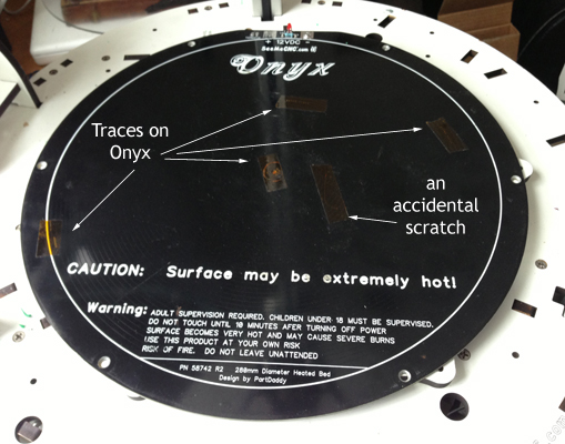 I've completed the first run of ten Aluminum Heat Dissipator Plates for the Onyx heated bed. These will work on both the version 1 and 2 Onyx beds. The plate is fabricated from 1/8" aluminum and is 12 1/8" OD so it can be attached securely with the six original Onyx screw mounting locations (a 12" diameter plate will likely not be large enough to allow screwing down at all six locations). A cutout for the Onyx's electronics pad maximizes your available print area. You can print directly on the plate, add tape (Kapton or blue painters) or top with the SeeMeCNC borosilicate glass. One nice feature is the plate acts as a spacer so you can properly center the borosilicate glass on your bed). You'll also get six longer mounting screws and 4" of Kapton tape for insulating the exposed traces on the Onyx.