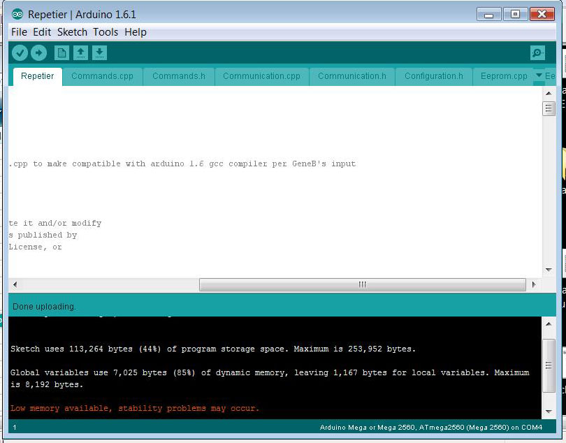 "I just spoke with John our resident Firmware GURU about the Low Memory notice is nothing to be concerned with. It is a notice that 70% or more of the memory has been used and is new to the 1.0.6 version of Ardunio that was recently released (which is why it is not mentioned in the manual)"