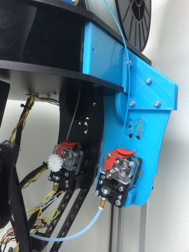 I'm finished with modification. All run very well, only I have problem with setting in Simplify3D with dual extruders. From second extruder flowing filament. I'm set custom gcode in tab Tool Change G-code E-8.4 F800, but second extruder with PVA filament flowing. Edit: