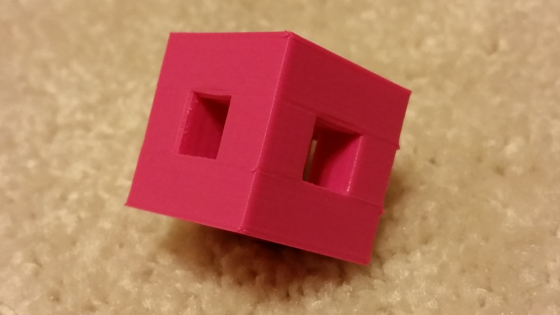 Alright, I'm proud to report that the replacement spool from Coex arrived yesterday and it prints quite nicely! I think I mentioned in a previous post that the filament on the spool is nice and shiny, and I was hoping that effect would persist on the finished part. It really does - the part is nice and glossy right off the printer, and that's for both the maroon PLA and the magenta ABS that I've printed with. The new spool of ABS is nice and clean too - I gave the spool a really close look and didn't see any evidence of the same problem the previous spool had, and after printing two test cubes I didn't see any grime stuck in the melt zone when I pulled it out either.