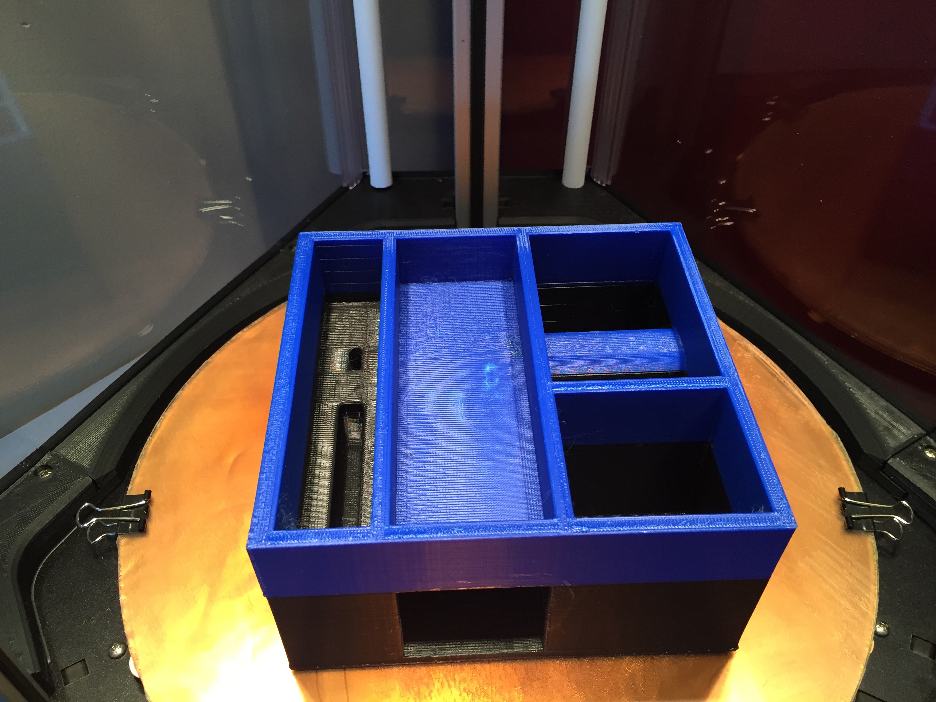 I used too dense of support material in the square cavity (a future drawer) and it was a real pain in the butt to remove it. You can see from the top view the I scratched up the face of the box and damaged/stretched the floor of one of the "bins" (white marks) with a screwdriver trying to remove the support material.