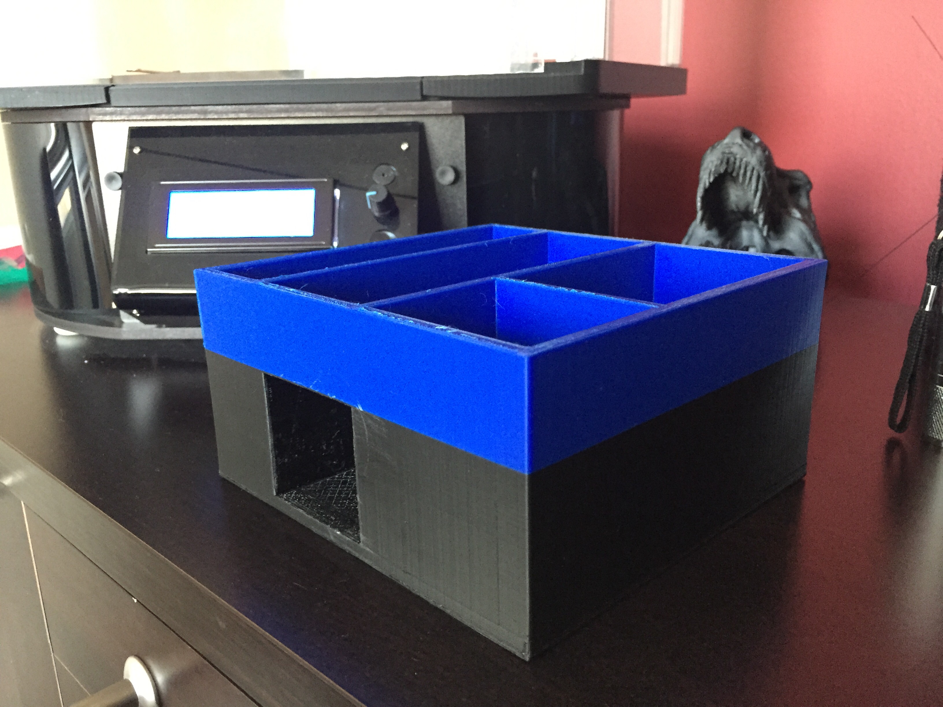 I used too dense of support material in the square cavity (a future drawer) and it was a real pain in the butt to remove it. You can see from the top view the I scratched up the face of the box and damaged/stretched the floor of one of the "bins" (white marks) with a screwdriver trying to remove the support material.
