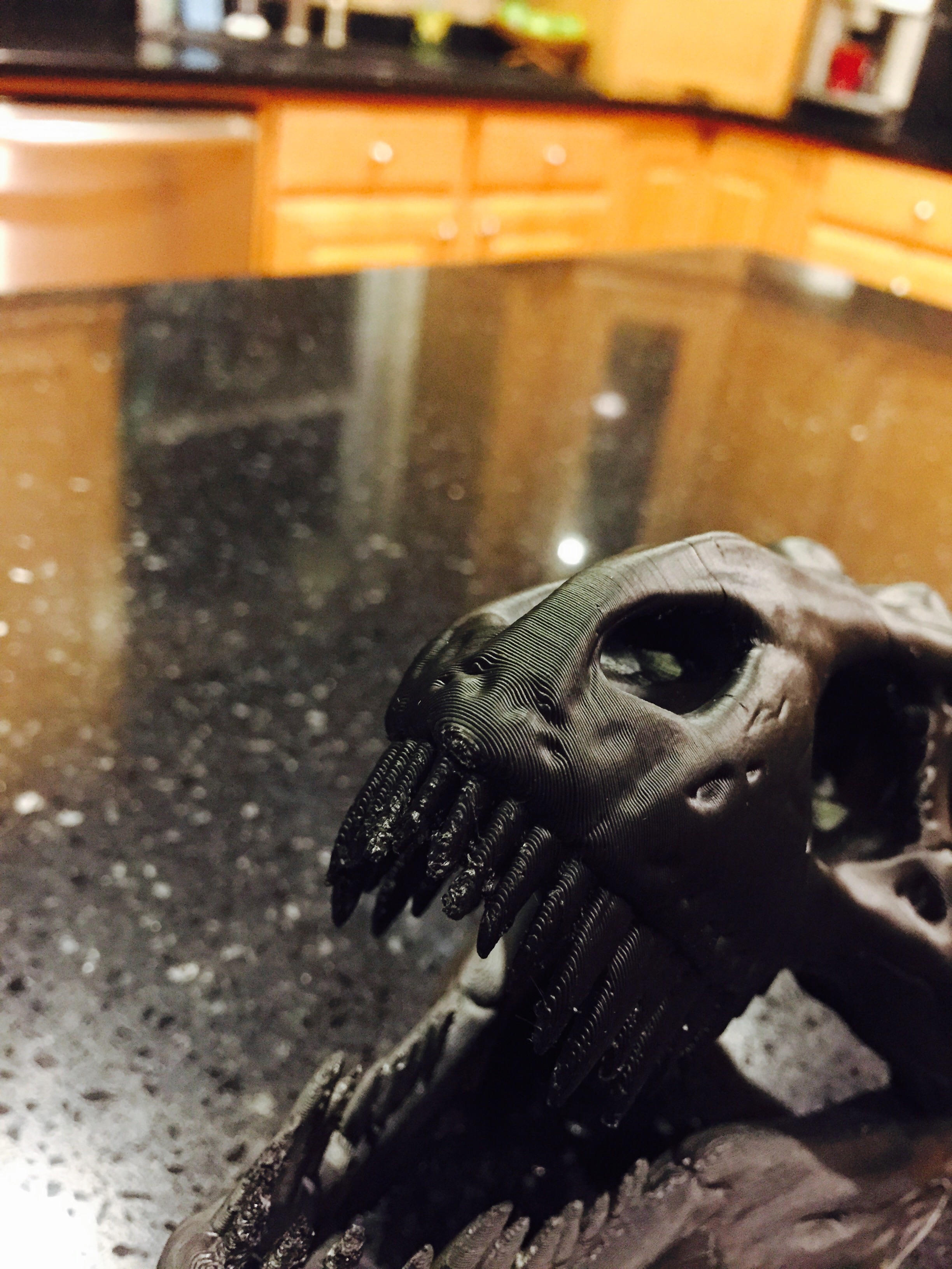Started the T-Rex skull. I don't ghinknit is too bad. Since I deleted all my slicer profiles trying to figure out my "fill issues" I did get a few blebs!! Will adjust my speeds. I also find that when my iMac processor gets loaded down I get some pauses that causes Blebs.