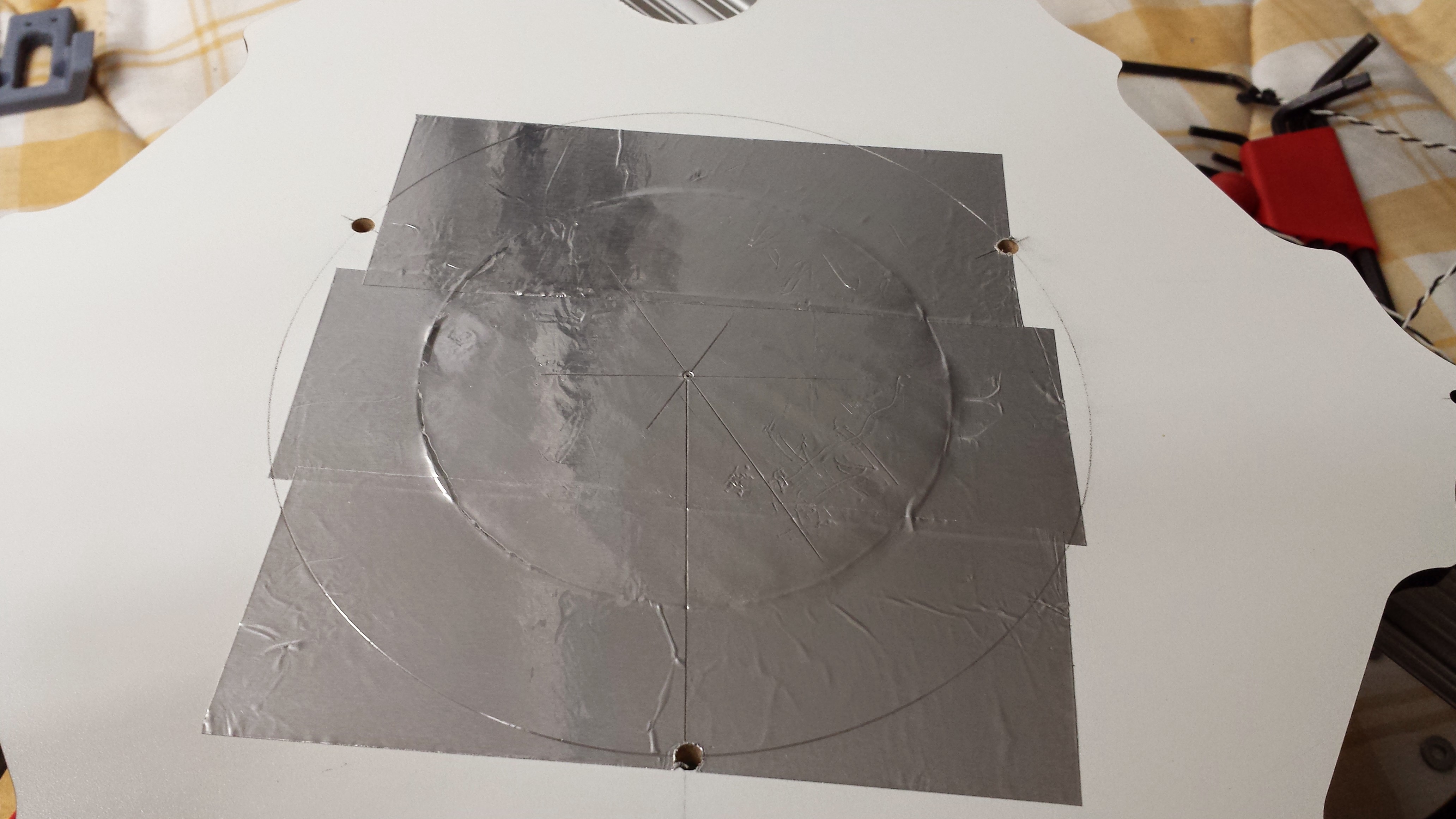 The stock insulator needs to be drilled for a 6.0" dia hole pattern as shown. I had filled the hole some time ago to keep drafts off the heated bed with a couple layers of cardboard and was able to use it to stick a compass point.