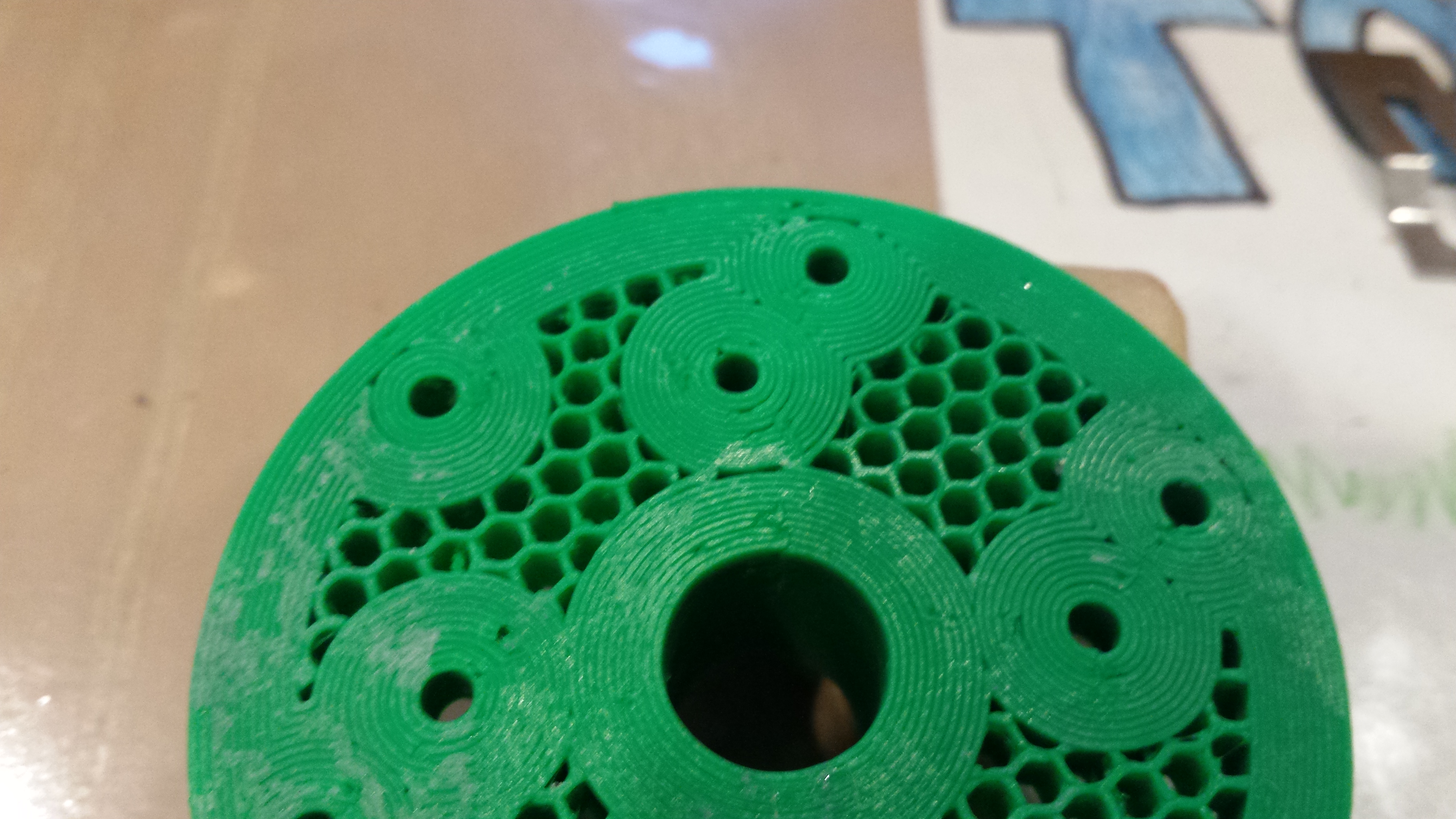 I used Slic3r with zero bottom layers, and set the honeycomb infill at 25%-ish for the back face of the spool holder and the outer face of the spool. I had the vertical perimeter layers set at ten or eleven.