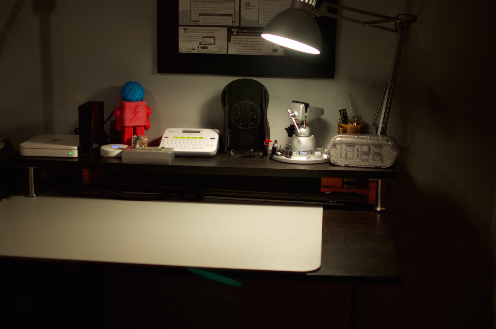 I got my Rostock Max v2 at Maker Faire Bay Area 2014 and never actually got around to sharing my setup, so here are some photos featuring my printer in all its glory: